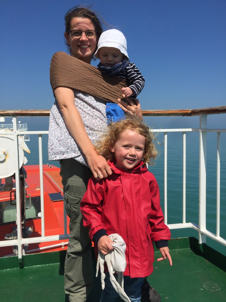 La traversée semble durer des heures. Nous partons à 12h. Pile-poil pendant le temps dédié aux siestes, donc il était inévitable que les enfants nous le fassent payer. Il nous aura fallu beaucoup de patience. Max est passionnée par les jeux vidéo, et pas trop par les dessins-animés. Arsène s’endort dans mes bras après un nombre incalculable de tour de bateau, et de nombreux petits vomitos. Avec Clem, on est exténué, et on sait qu’en arrivant on va devoir pédaler jusqu’à Brighton… Maigre consolation, en théorie puisque les enfants n’ont pas dormi de la journée, ils devraient être plus calmes quand on pédale et ce soir… Ou pas.