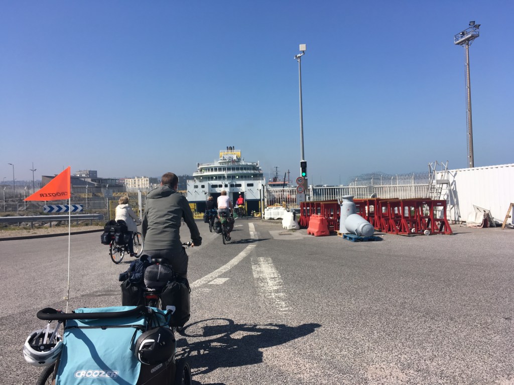 Après des petites courses de dernière minute, on file vers le port. Nos passeports sont prêts. Les enfants pas hyper contents d’être dans la carriole de bon matin, et on se rapproche de l’heure du déjeuner pour Arsène sans possibilité de réchauffer son petit plat. En plus, petite surprise, au moment du contrôle des billets, il semblerait que je ne sois pas enregistré ! Obligé d’aller à l’accueil pour modifier cela et de refaire la queue pour le check-in. Les enfants râlent. On reste serein malgré tout. Le soleil tape fort. La mer a l’air calme. Clem a déjà pris son médoc contre le mal de mer. Arsène patient relativement bien pour son déjeuner. Petite émotion en embarquant sur le bateau, cela fait plusieurs années qu’on est pas allé en Angleterre. Et puis, quitter son pays, ça fait un peu plus « vacances » que quand on reste dans son pays. Bah oui ! C’est plus dépaysant !