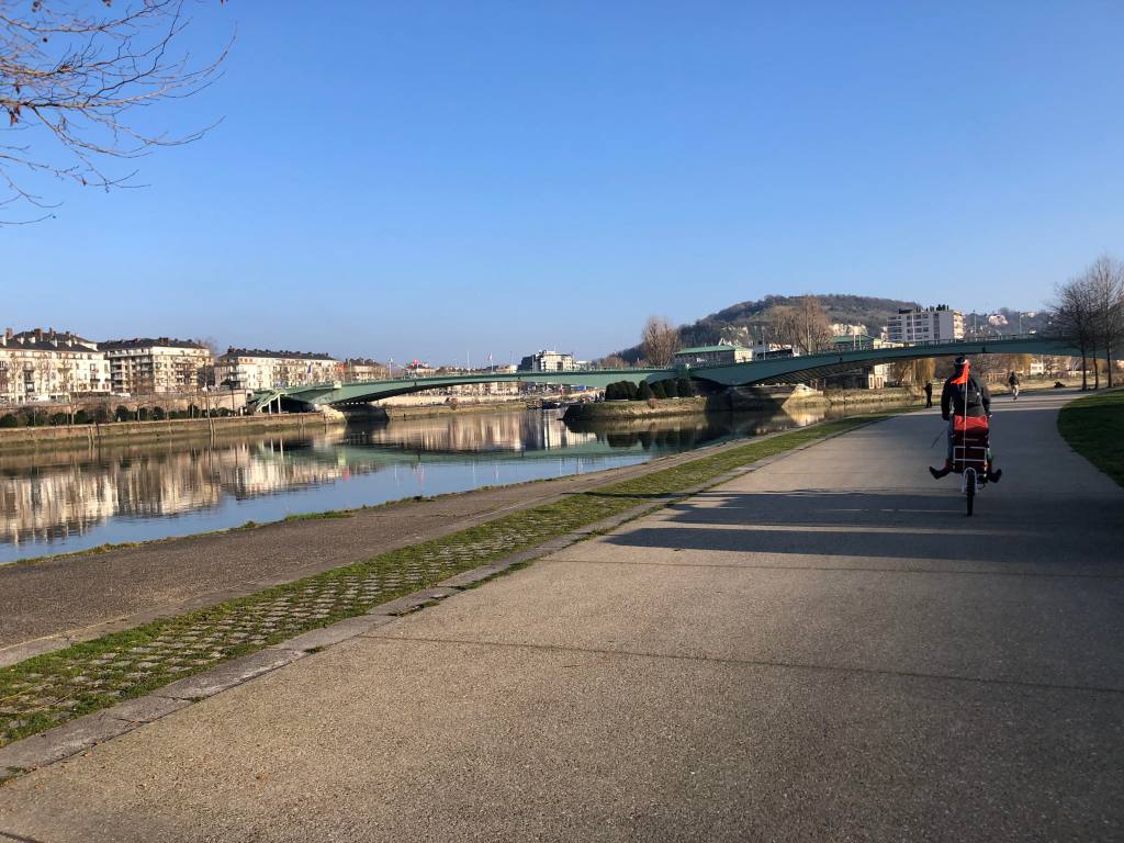 Hier, profitant de l’absence surprise de la maîtresse d’Arsène, nous avons pu continuer de tester la remorque Weehoo. Le ciel était bleu, le soleil réchauffait timidement le froid hivernal de janvier. Arsène était ravi de monter à bord de son véhicule comme à chaque fois. Il arrive à se débrouiller tout seul pour y grimper et pour s’attacher. Il a bien apprivoisé la bête. Clem de son côté avait une nouvelle occasion d’étrenner son Farradmanufaktur flambant neuf et Marc de retrouver son Btwin bien réglé après un passage dans les ateliers de Decathlon.
