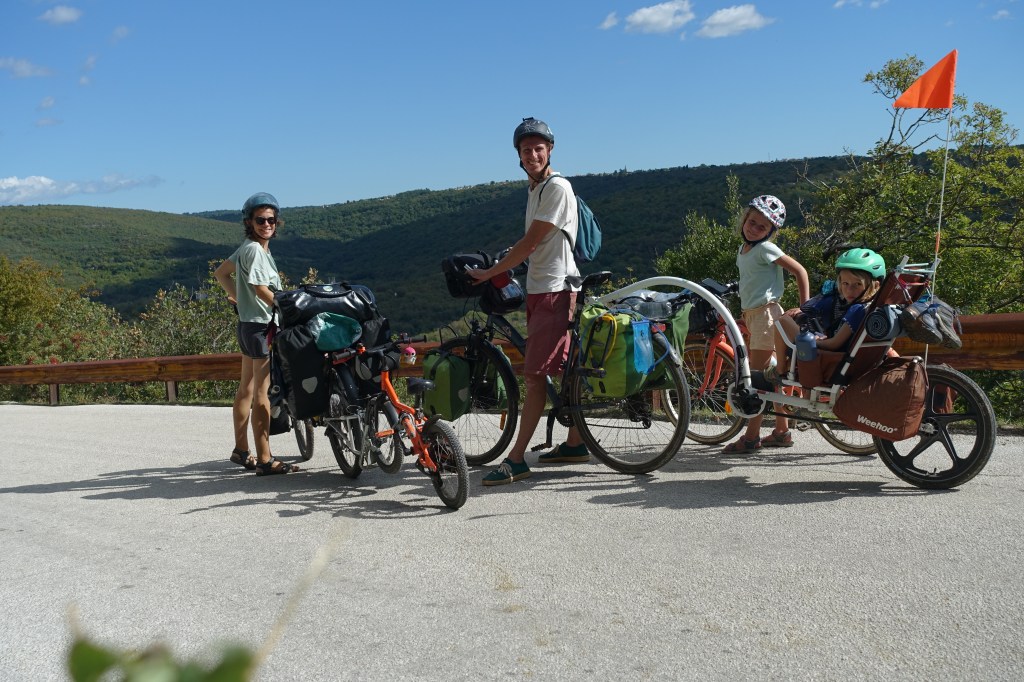 Nous prenons la route, une étape d’une vingtaine de kilomètres pour rejoindre Brestova où nous voulons prendre un ferry pour l’île de Cres. Après à peine quelques kilomètres, mon vélo se bloque. Mon dérailleur est en train de se coincer dans les rayons de ma roue arrière. Merde ! Il s’est dévissé et je le remets sans peine mais il s’est tordu dans l’affaire. Dès que je suis sur le plateau 2, un bruit de chaîne légèrement désaxé se fait entendre. Reloud. Je passe l’aprem en plateau 1. Nous pédalons une petite dizaine de kilomètres à enchaîner descentes et montées. Maxine pédale sans soucis, Arsène s’est endormi. Il est 16h45 quand nous faisons une courte pause. Le soleil est moins chaud. La circulation tranquille sur ces routes secondaires. Après Nedescina, nous avons plusieurs kilomètres de descentes, dont une longue partie sur une route fermée à la circulation déserte et avec un revêtement neuf.