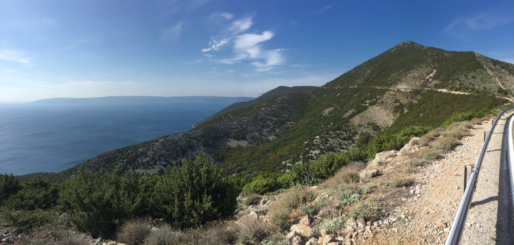 Nous appelons un taxi. Les enfants s’amusent comme des fous dans les rochers en attendant. La voiture arrive et nous y chargeons le vélo de Maxine, celui de Clem et celui d’Arsène. Nous y chargeons également toutes les sacoches dont les miennes. Clem et les enfants partent et doivent se faire déposer à l’embarcadère de Merag. Je continue de pédaler, léger, le taxi viendra me récupérer après, dans 50 minutes environ. Cela me laisse le temps de pédaler et de kiffer en solitaire. Je rajoute une bonne grosse centaine de mètres de dénivelé aux 300 mètres gravis en famille. Et là, je me rends compte que nous avons bien fait de ne pas nous obstiner à vouloir grimper à vélo cette île. En plus du dénivelé, le vent est de face, et le ravin tout proche et pas toujours bien protégé. La route arrive sur une crête, et c’est ahurissant. Les flancs de la montagne de chaque côté plongent vers les eaux turquoises de la mer adriatique. Le vent hurle autour et tente de m’envoyer hors de la route.