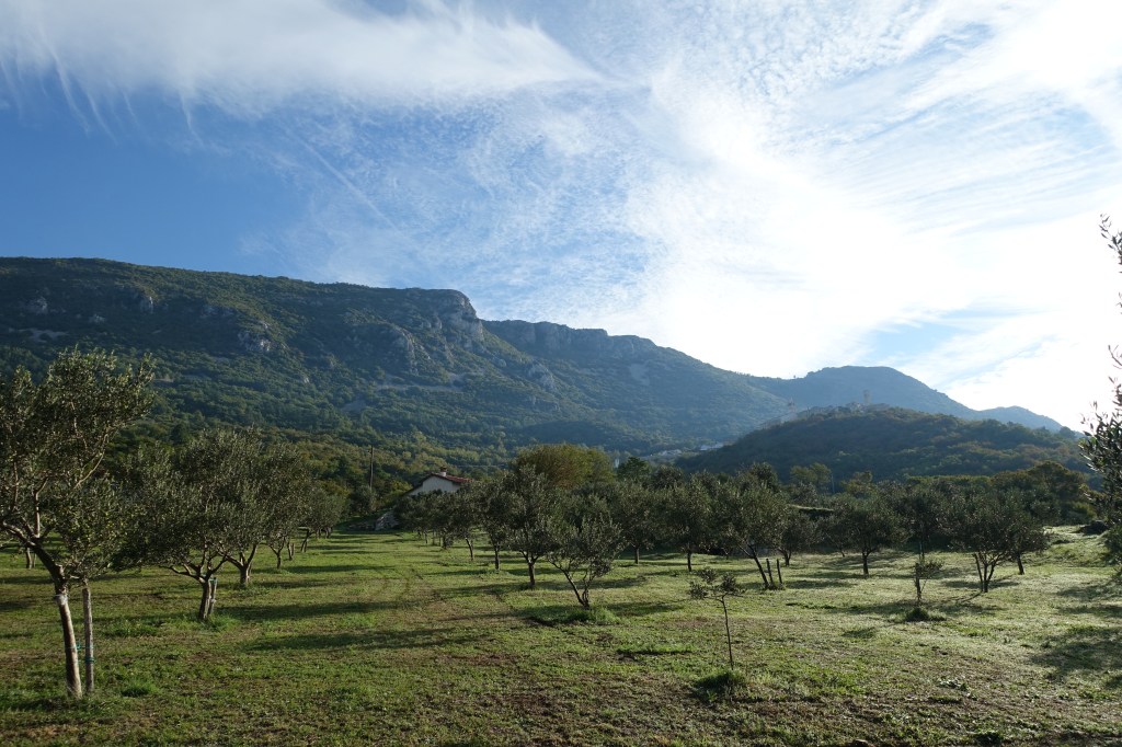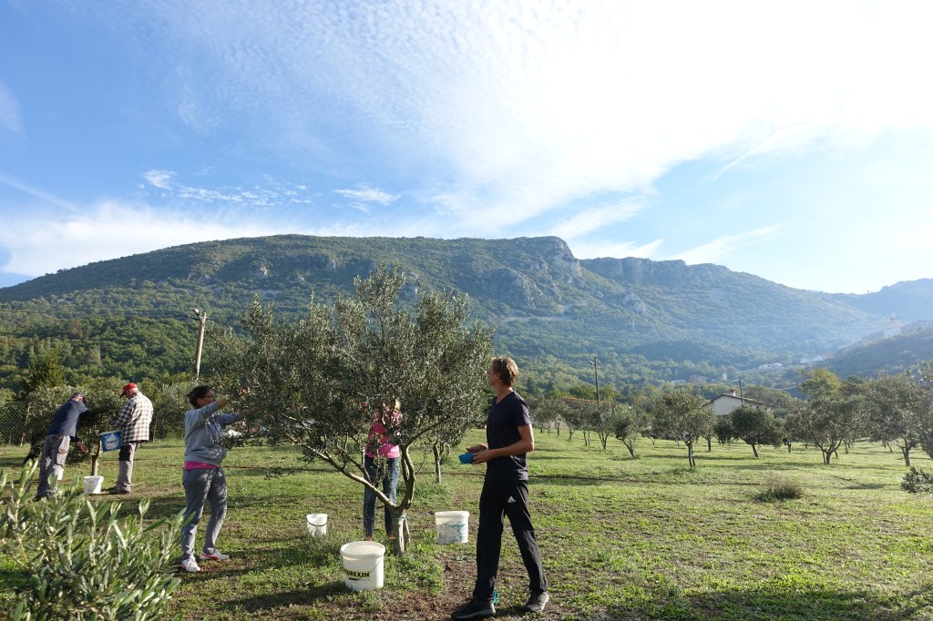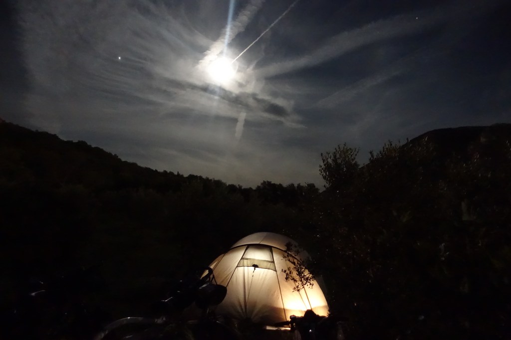 Nous mettons nos manteaux pour continuer les descentes. Le vent est frais. Nous voilà maintenant sur la route 64, jusqu’à Vozilici. Pas trop de circulation et une route large qui permet de se faire doubler sans se faire tailler un short. Nous devons en principe continuer notre route sur la nationale 66, la même que celle de mardi quand nous avions bien flippé. Il est presque 18h, et cela ne nous enchante pas du tout. Clem part aux alentours à la recherche d’un coup de main éventuel, une camionnette qui voudrait bien nous embarquer. Je repère un chemin alternatif qui permettrait de sauter une partie de la nationale mais nous aurons un petit mur à pédaler. Nous optons pour cette solution en gardant en tête qu’il faut trouver un endroit pour dormir. Nous filons vers la vallée au creux de laquelle se trouve une magnifique centrale à charbon, avec une immense cheminée rayée blanche et rouge. Nous attaquons le mur, dépassons trois chiens errants. Je tiens la perche de la GoPro dépliée au cas où mais les chiens ne font pas preuve d’agressivité. La lumière rose de fin de journée sur la roche blanche de la montagne est hypnotisante. Nous poussons nos vélos. Seul Arsène a de l’énergie pour chahuter. Un champ d’oliviers sur notre droite. La récolte a commencé et une famille s’active à ramasser les précieux fruits. Je demande à l’un de ses membres si nous pouvons planter la tente ici. Discussion en Croate/Italien avec un autre membre. On capte des « no », ok. On est prêt à repartir mais en fait c’est good ! On peut planter la tente au milieu des oliviers ! Les champs est envahi de plantes aromatiques, l’odeur est enivrante. Vue sur la montagne derrière nous, vue sur la centrale devant. La famille nous invite à participer à la récolte des olives demain matin sur le ton de la blague, mais nous sommes super enthousiastes à cette idée ! Nous devrions gagner un petit déjeuner en échange d’un coup de main !