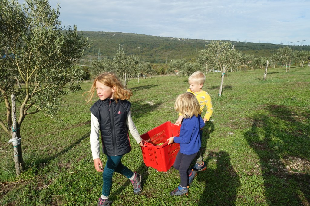 Ce matin, après le petit déjeuner sous la tente (pour éviter le froid et la très forte humidité), nous retrouvons Patrizia et sa famille/amis dans le champ d’oliviers. La cueillette commence tôt ! Nous passons la matinée à dépouiller les arbres de leurs petits fruits verts. Les enfants participent à leur niveau. Maxine grimpe dans certains arbres pour attraper les olives les plus hautes. Arsène cueille celles des branches basses. Ils apprécient renverser les seaux de chacun dans les grandes caisses. Toni, un petit garçon de 6 ans, les emmène faire des tours de minis quads électriques et ils s’attèlent ensemble à la tache. Nous y passons toute la matinée. Nous sommes heureux de pouvoir participer et de remercier en filant un coup de main. Nous sommes invités à déjeuner avec tous les cueilleurs. Un bon repas où chacun se sert dans les plateaux de charcuterie, fromages ou d’omelettes aux asperges.