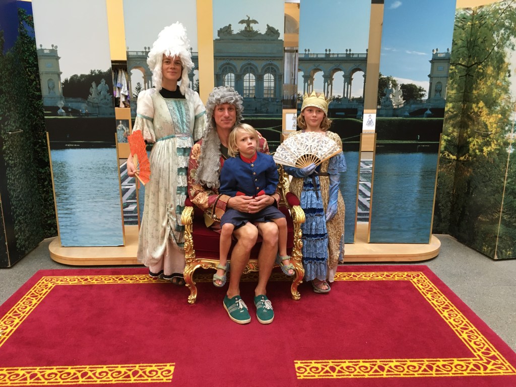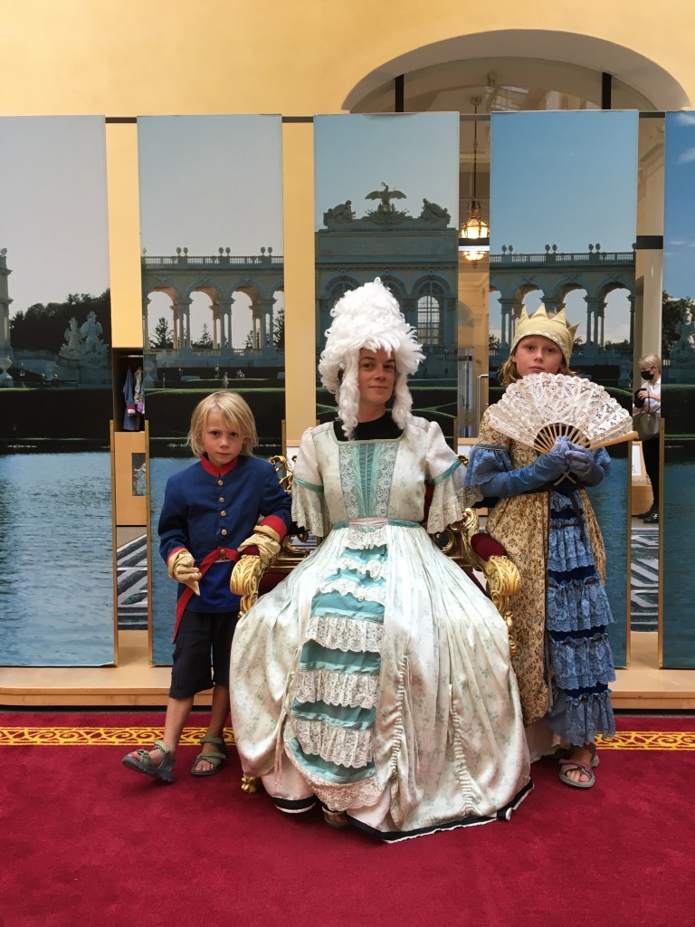 Métro ligne U1, direction Lelpoldau, à Keplerplatz, changement à Karlsplatz, ligne U4, direction Hütteldorf. Le ciel bleu est au rendez-vous. Visite du musée des enfants, le parc et jardins du chateau. Les enfants peuvent se déguiser et nous aussi avec des costumes du 18ème siècle. Après trois mois sans déguisement, on en a bien profité !