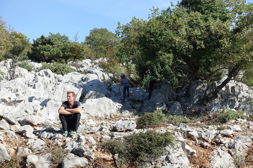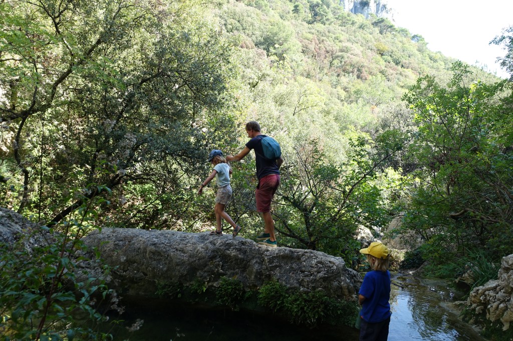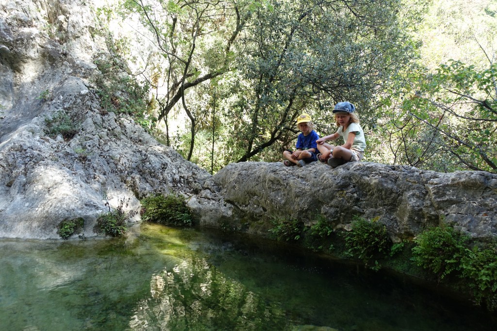 Réveil tardif à 8h16. Juste avant de partir, nous buvons un café au soleil avec les pieds dans la piscine. Il fait chaud aujourd’hui ! Nous quittons le petit camping de Kapelica, et pédalons 2,5 km jusqu’à Labin. Nous attachons nos vélos, et partons faire une randonnée. Le chemin escarpé descend le long d’une rivière presque asséchée à cette époque de l’année. Arsène manque un peu de motivation au départ mais il devient « Cactus », le dinosaure de compagnie de Maxine et les voilà qui dévalent les chemins. Nous pique-niquons dans une gorge au bord d’une piscine naturelle encore plus transparente que celle du camping, l’odeur de chlore en moins mais la température identique. Nous empruntons ensuite un chemin indiqué comme difficile qui relève plus de la varappe que de la randonnée. Quelques petites sueurs froides pour nous, beaucoup d’amusement pour les enfants. Arsène qui nous disait qu’il rêvait de grimper hier est ravi !