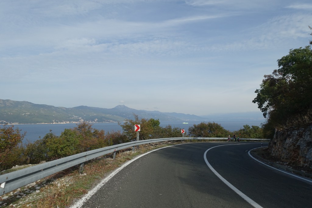 La route nationale est en effet moins fréquentée, mais on reste concentrés et vigilants. La majorité des véhicules fait attention mais il y a toujours des chauffards. Nous sommes contents de quitter l’EV8 en allant sur les îles car celle-ci continue sur la nationale jusqu’à Zadar. Quand nous la quittons pour rejoindre le port de Brestova, la pente est de 14%, de quoi faire grincer les freins. Une longue descente serpentée jusqu’à l’embarcadère s’offre à nous. Le panorama est impressionnant. L’île de Cres se dresse de l’autre côté, une montagne qu’il faudra traverser demain.