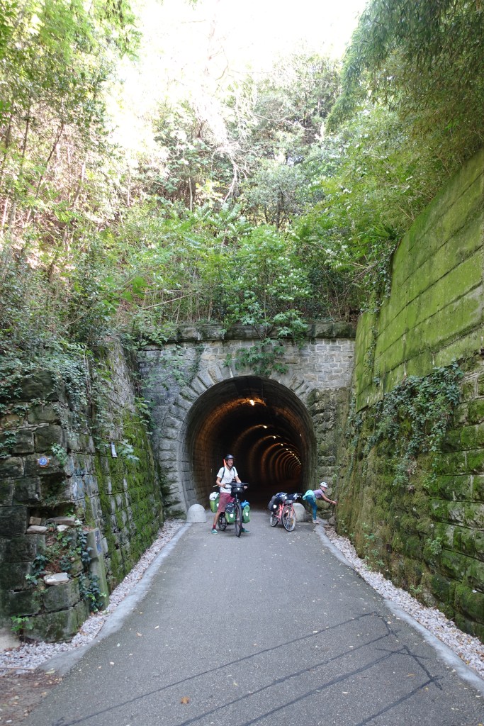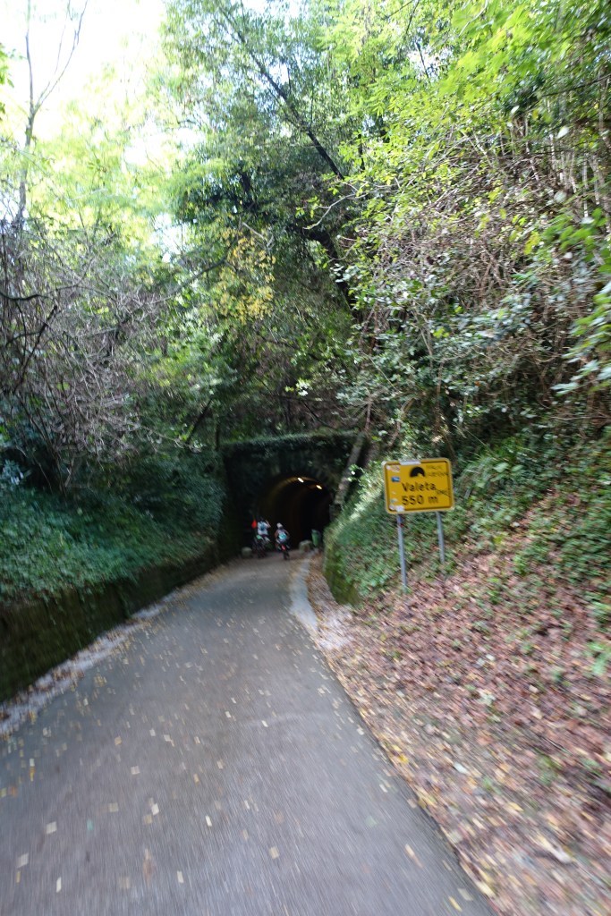 Après une petite côte qui chauffe les muscles, nous arrivons à l’entrée du tunnel de 550 mètres. Percé entre 1900 et 1902 sous l’Empire Austro-Hongrois, il servait pour les trains. Les enfants sont ravis de pédaler dedans. Il y fait frais. Maxine ne se rend même pas compte qu’il s’agit d’un faux plat montant !