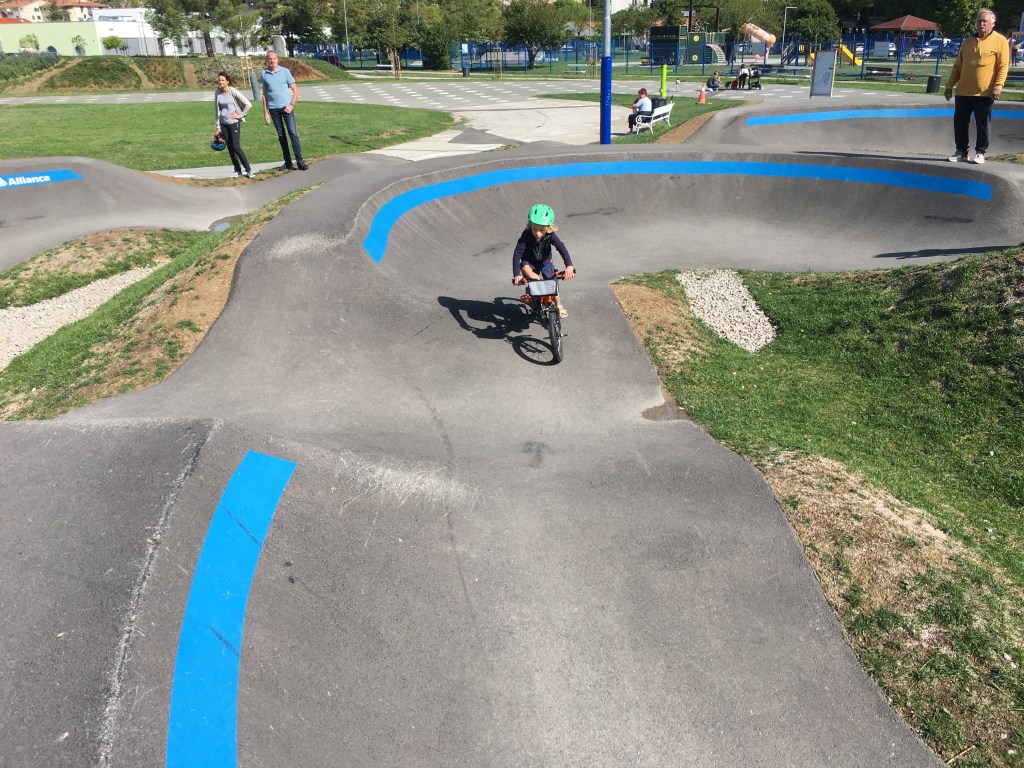 Nous faisons une pause juste avant la frontière croate. Un parcours « pumptrack » occupe bien les enfants qui enchaînent les tours de piste. Il y a aussi un mur d’escalade qui n’intéresse que moi aujourd’hui.