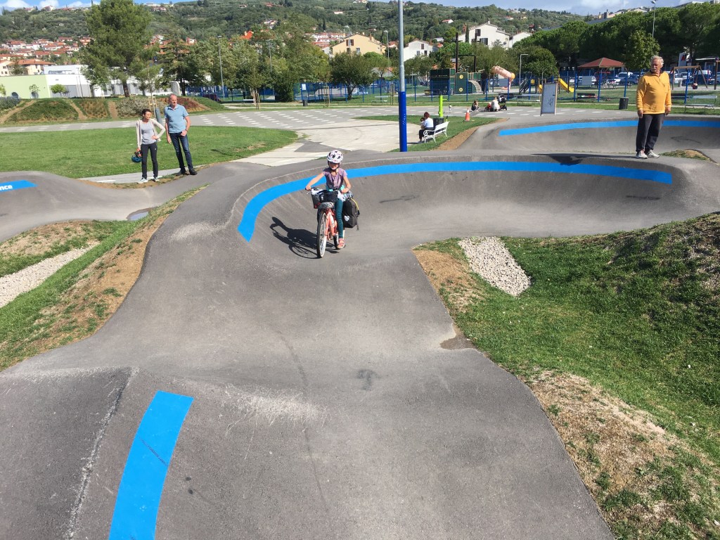 Nous retrouvons le littoral et ses chemins déserts après un long passage caillouteux et en proie aux moustiques. La Croatie est finalement bien pistecyclée, du moins en Istrie. Les enfants sont en pleine forme et motivés. Après un arrêt goûter, nous stoppons quelques minutes à une pumptrack comme en Slovénie. Ils sont ravis, mais il faut repartir. Il nous reste encore 6 kilomètres avant le camping que nous avons repéré. Le seul qui n’ait pas l’air d’un complexe de merde. Arsène et Maxine roule super bien ensemble, jouant et discutant tout en épousant parfaitement les petits reliefs. C’est un vrai régal pour toute la famille. Ils viennent même à bout d’une côte plus longue et sur route partagée. Avec Clem, la fierté se lit dans nos regards.