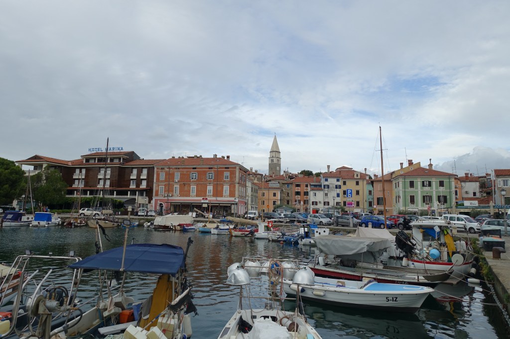 Nous repartons et découvrons que pour suivre l’Eurovelo 8, le plus simple reste de suivre les petites flèches sur les autocollants semés par des particuliers sur les poteaux pour pallier le manque d’indication officiel. C’est pratique, plus besoin d’allumer le téléphone à chaque croisement. Nous nous éloignons un peu du bord de mer, roulons sur la route 75, puis retrouvons les petits sentiers cyclo-pédestres. Certaines pistes sont neuves et au ras de la plage. Nous avançons dans un décor splendide. Les plages croates sont belles, quand elles ne sont pas complètement urbanisée par des immenses complexes d’hôtellerie. Nous longeons tantôt des champs d’oliviers chargés de leurs fruits, tantôt des campings aux dimensions hors normes. Pourvu que nous n’ayons jamais à dormir dans de tels endroits. Tous ces lieux sont vides. Et avec la météo mitigée du jour, il y a comme un air de village fantôme. Nous côtoyons également de belles demeures qui donneraient presque envie d’investir ici. Des tuiles rouges, des murs blancs, de l’espace, une vue sur la Méditerranée, une végétation luxuriante…