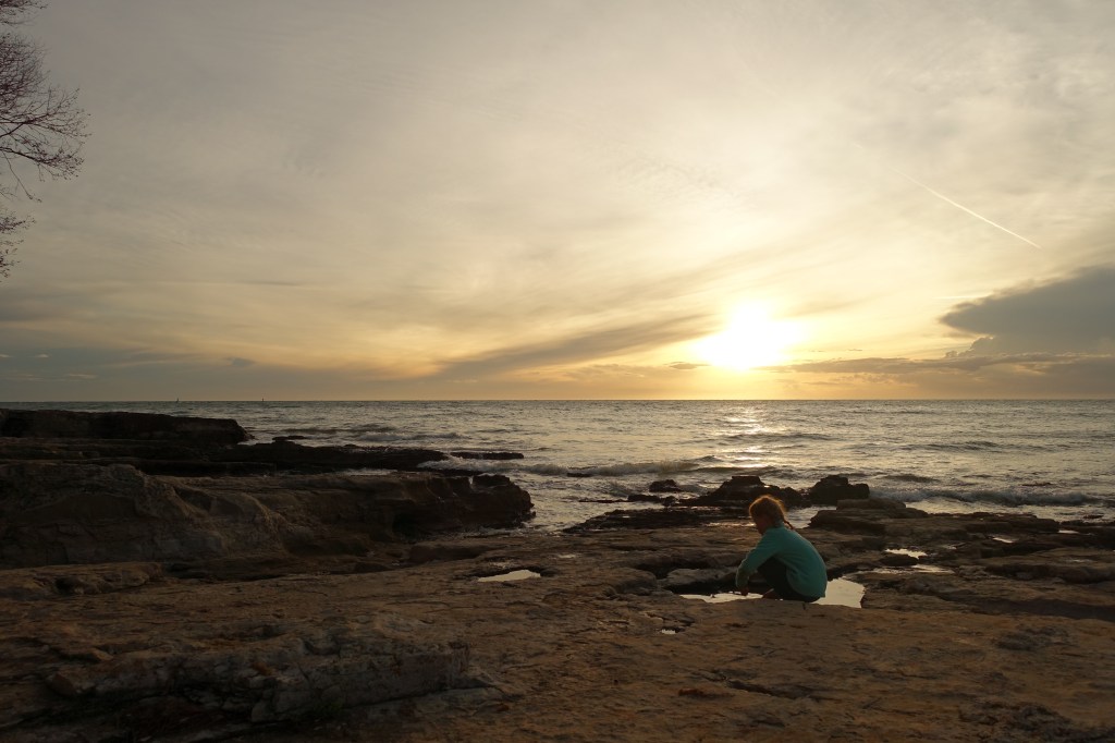 Nous partons à midi pour le port. L’idée est d’y laisser les vélos et de lézarder tout l’aprem à la proche plage. Malheureusement, en arrivant au port à 13h15 sous un soleil de plomb, on constate que le chemin pour la plage est inexistant. La côte à 8% nous empêche de sortir de là. Il va falloir y passer l’aprem… Nous nous posons d’abord sur le port au bord de l’eau. Pique-nique avec vue sur de nombreux poissons. Les enfants jettent des cailloux dans l’eau. On explore un peu les environs mais nous ne trouvons aucun endroit adéquate. Le soleil tape un peu même si on est le 11 octobre. Nous nous installons à l’ombre sur une terrasse de restaurant. Nous enchaînons les parties du jeu Bioviva sur les dinosaures. Les enfants ont chacun leur préféré. Le Spinosaure pour Arsène et le Galliminus pour Maxine. Le temps est long, mais les minutes continuent de s’enchaîner. Ouf, le temps ne s’est pas arrêté. Nous nous rapprochons de notre quai de départ. Les enfants sont un peu excités. Le soleil disparaît derrière des montagnes, l’atmosphère se rafraîchit. Des plots servent de poutre aux enfants. A l’approche du départ, l’attente est interminable alors que notre bateau est là. Enfin, à 18h on peut y monter. La chaleur de l’intérieur est réconfortante. Les roches blanches de la côte de Krk prennent une couleur rosée dans la lumière du coucher de soleil. Bizarrement, la traversée parait très mouvementé à Clem et à moi comme sur une mer d’huile.