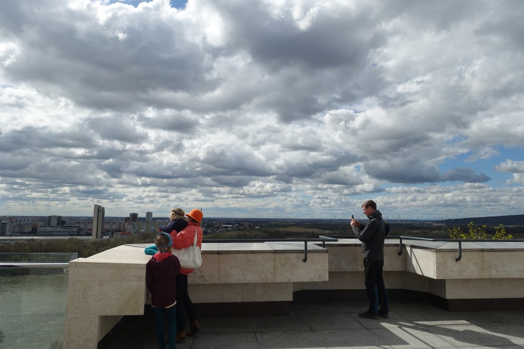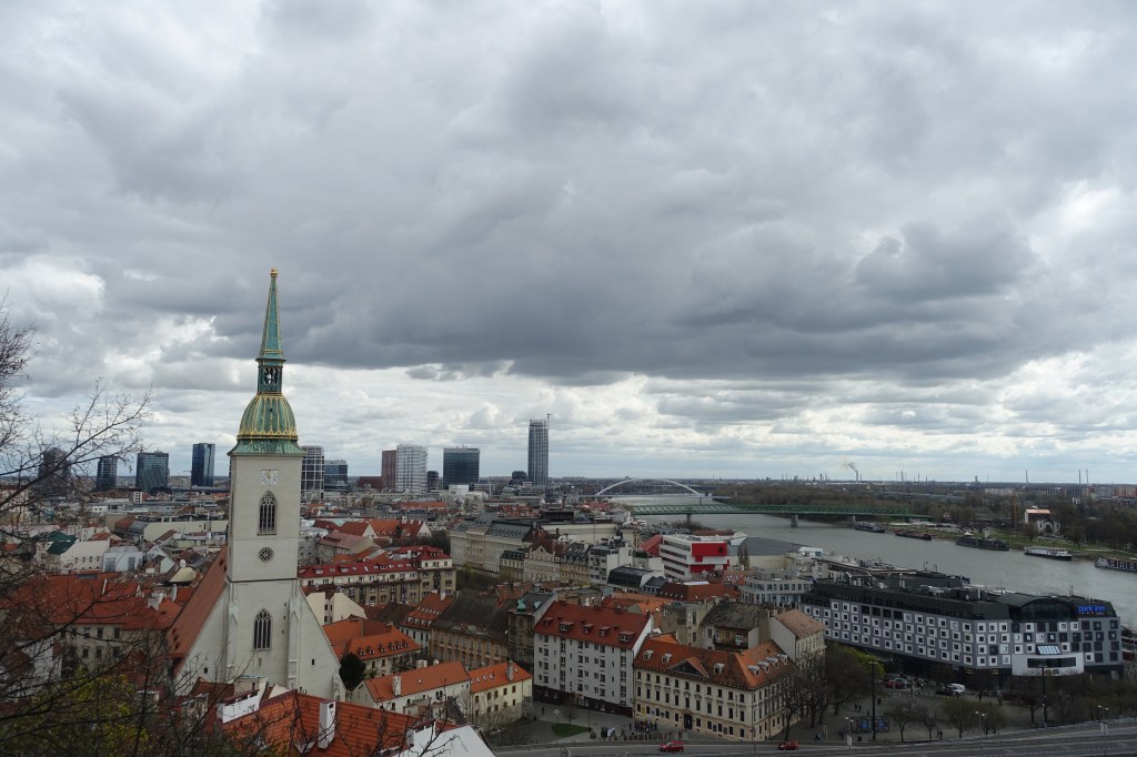 La rive sud du Danube déborde de barres d’immeubles colorées et en bon état qui fêtent leurs 50 ans aujourd’hui. En approchant du cœur de la ville, nous ne pouvons pas manquer le château entièrement reconstruit à la même période que les barres d’immeubles, dans un style baroque qui manque un peu de charme tout de même mais reste majestueux comme on l’attend d’un tel château. La terrasse autour du château offre une vue assez particulière sur tous ces immeubles d’habitation au sud, et à l’est, derrière la vieille ville, on ne peut louper les gratte-ciels du quartier d’affaire. A l’horizon, une ribambelle impressionnante d’éoliennes qui se trouvent toutes en Autriche.