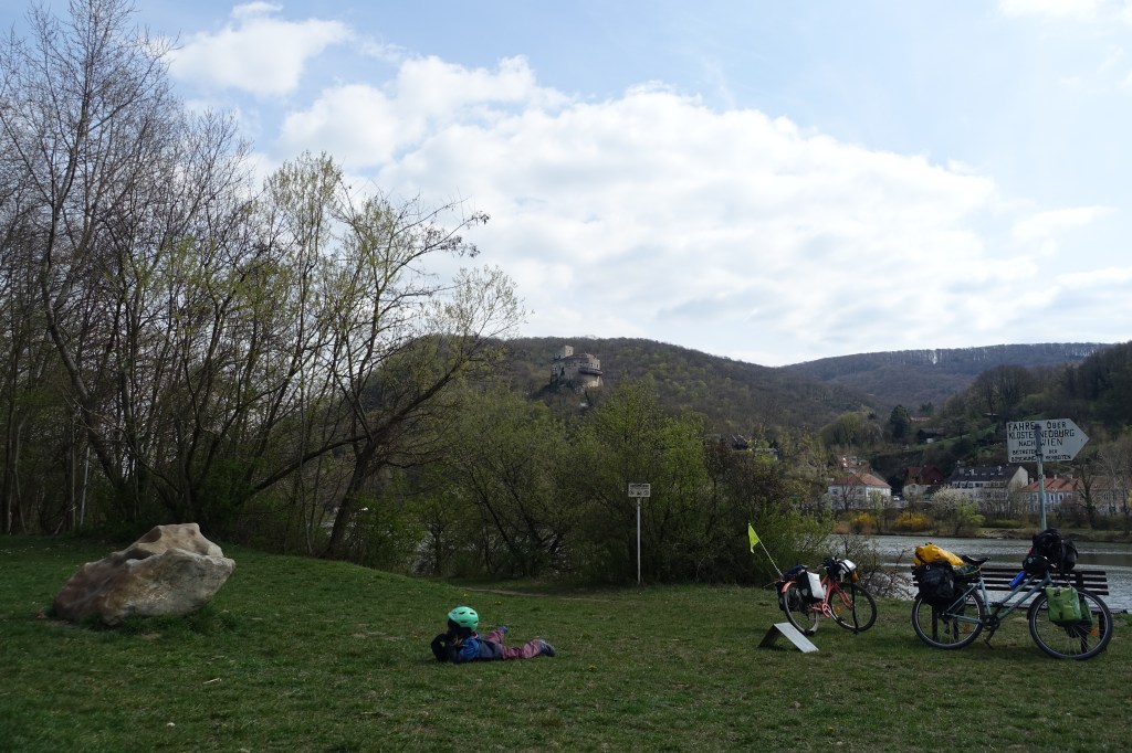 Pique-nique au soleil. Purée ! Ça fait du bien ! Au pied des collines qui ont souvent de jolies formations rocheuses qui donnent envie de grimper. Avec ce ciel sans nuage, le Danube devient enfin bleu. Le voilà le beau Danube bleu !