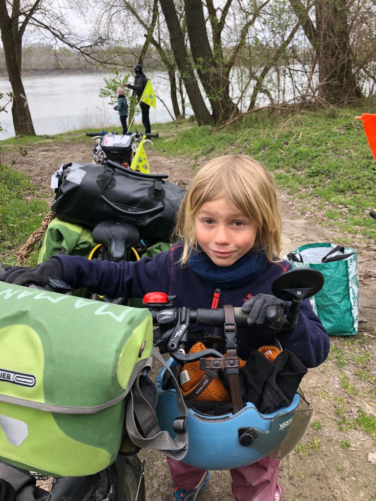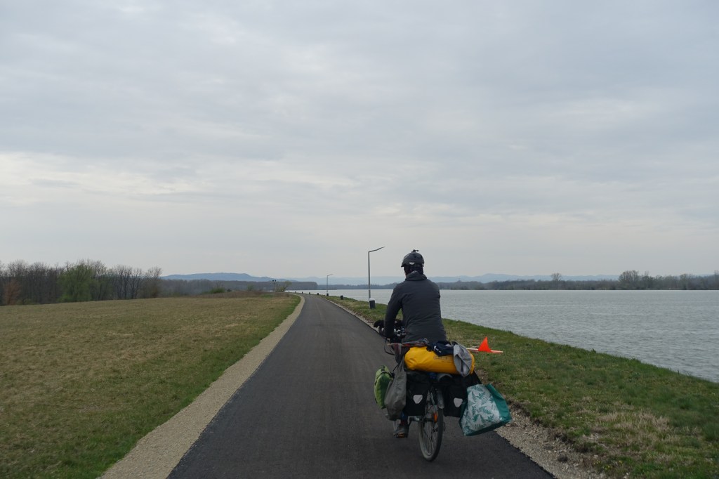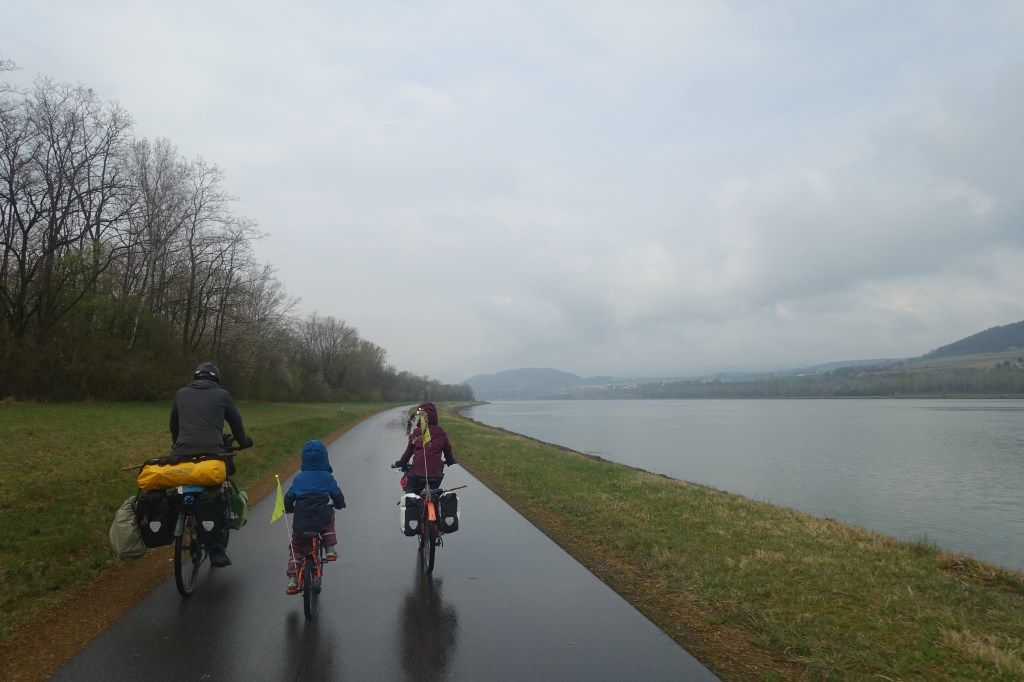 Nous retrouvons la digue du Danube ! Et un vent frais et fort. Mais vraiment fort. Tellement fort qu’il fera encore tomber Clem. Nous avançons, concentrés sur l’objectif et motivés par une nuit au chaud. Maxine entonne des comptines. Les rafales nous épuisent, nous freinent. Arsène encourage Clem.