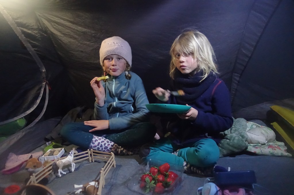 Ce matin au réveil, il faisait trois degrés dans la tente. Les enfants n’ont pas eu très faim pour le petit-déjeuner et avant la fin de celui-ci, Arsène s’est endormi dans mon duvet. Maxine a fait une leçon d’anglais sur Pâques avec Clem, pendant que je continuais de manger mes tartines. Le matin, j’ai beaucoup d’appétit, d’autant plus que Hedvige nous a donné un pot de confiture de cassis… Un véritable délice !