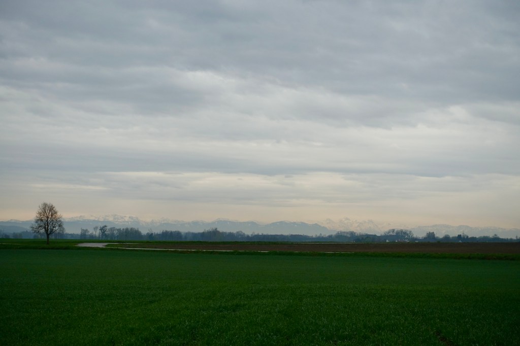 Il n’a pas plu de la nuit, il se met à pleuvoir juste avant le rangement. ALUMINIUM ! (C’est comme nickel mais avec un autre métal) (j’ai hésité avec cuivre, étain ou encore bronze, mais aluminium sonnait mieux). Nous arrivons à gérer une session d’école sous la tente avant de sortir les sacoches et les enfants. En sortant prendre l’air, j’aperçois un paysage majestueux au loin qui ne se devinait pas le moins du monde hier soir : les Alpes se dressent au sud. Recouvertes d’un magnifique manteau blanc aux reflets légèrement rosés grâce aux premiers rayons du soleil qui s’estompent déjà. Les pics s’élancent vers le ciel comme des flèches tirées depuis le centre de la terre. C’est beau ! Des étoiles dans les yeux, je cours à la tente et Clem sors à son tour immortaliser la scène.