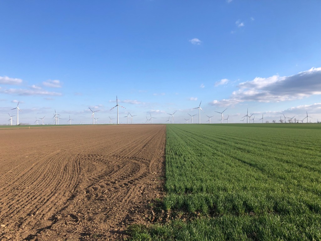 Nous continuons de rouler. L’itinéraire nous emmène dans un dédale de petites rues tranquilles avant de rejoindre une route partagée. Ça monte légèrement et ça descend peu. Le vent ne se fait pas trop sentir. Il nous pousse légèrement. Puis nous arrivons sur un chemin de gravier. Nous alternons les passages face au vent qui démoralise et vide notre énergie avec des moments où le vent nous fait avancer sans pédaler. Il fait tout de même froid. Nous sommes au milieu d’un immense champ d’éoliennes, peu de possibilités de bivouacs.