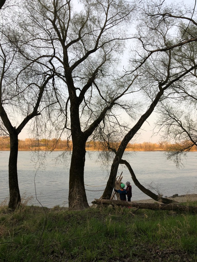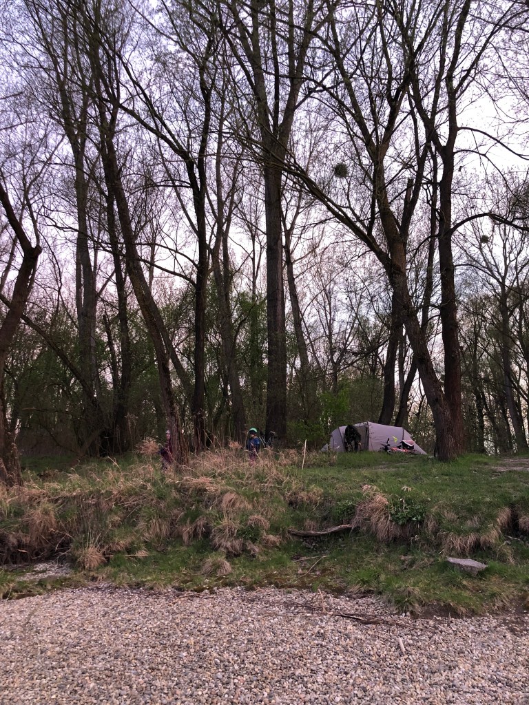Nous retrouvons le Danube dans une réserve naturelle, loin de la civilisation. Au bout quelques minutes, nous dégotons un chouette endroit pour déplier la tente au bord du Danube, au-dessus d’une jolie petite plage de galet. Il y a une cabane à moitié construite, les enfants sont ravis et revivent !