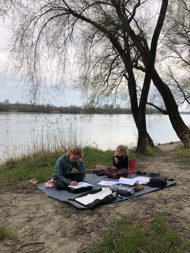 Nous faisons l’école au bord du Danube. Le décor est merveilleux. Le vent est absent ce matin. La journée s’annonce agréable. Un bateau de police passe sur le fleuve… La tente est déjà démontée, ouf !
