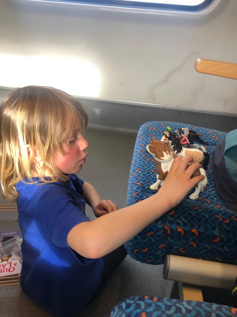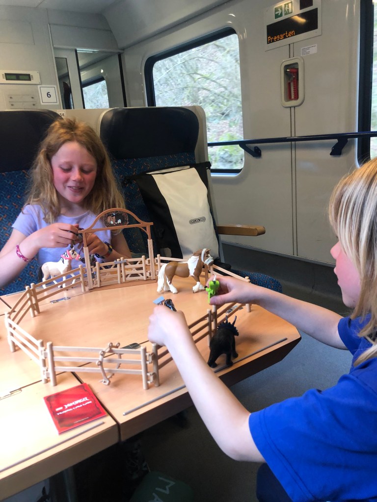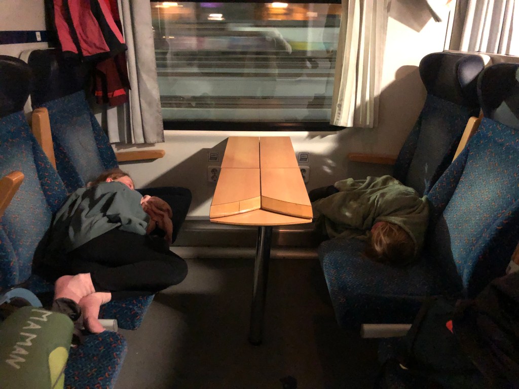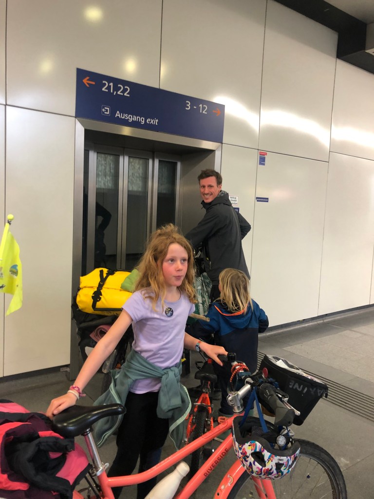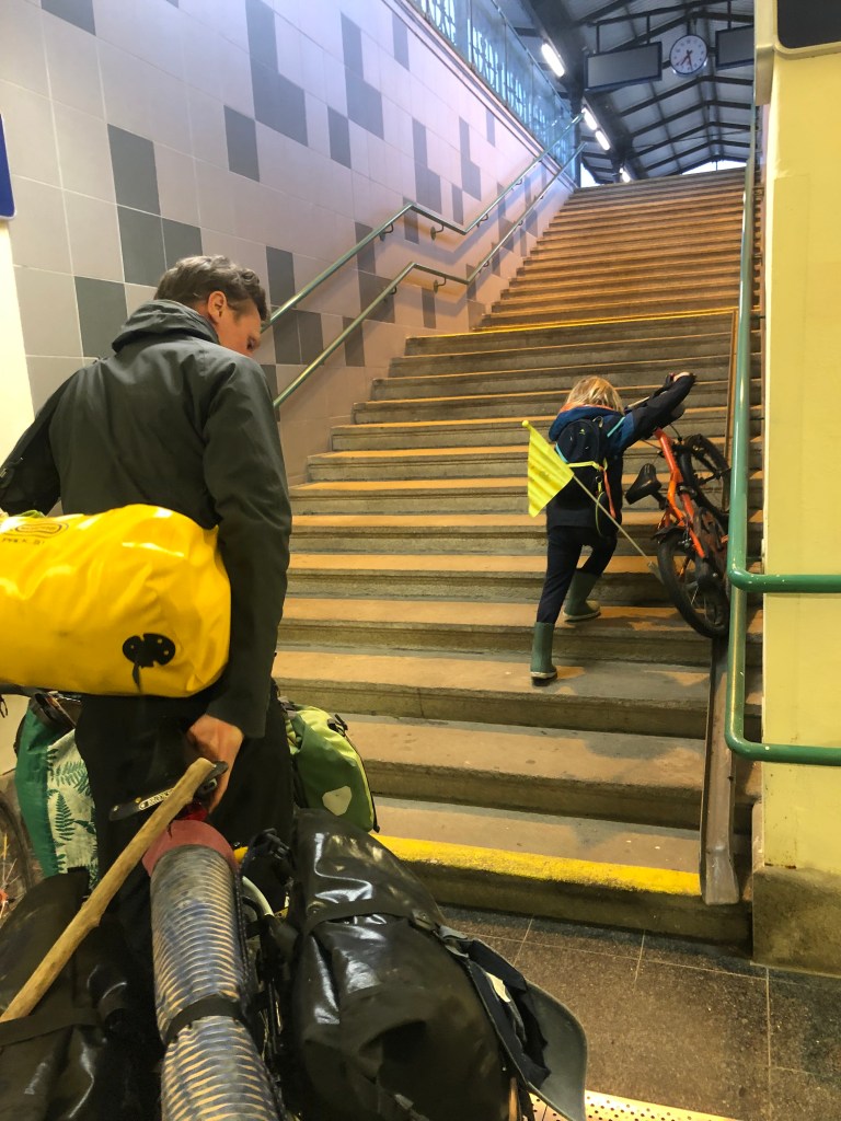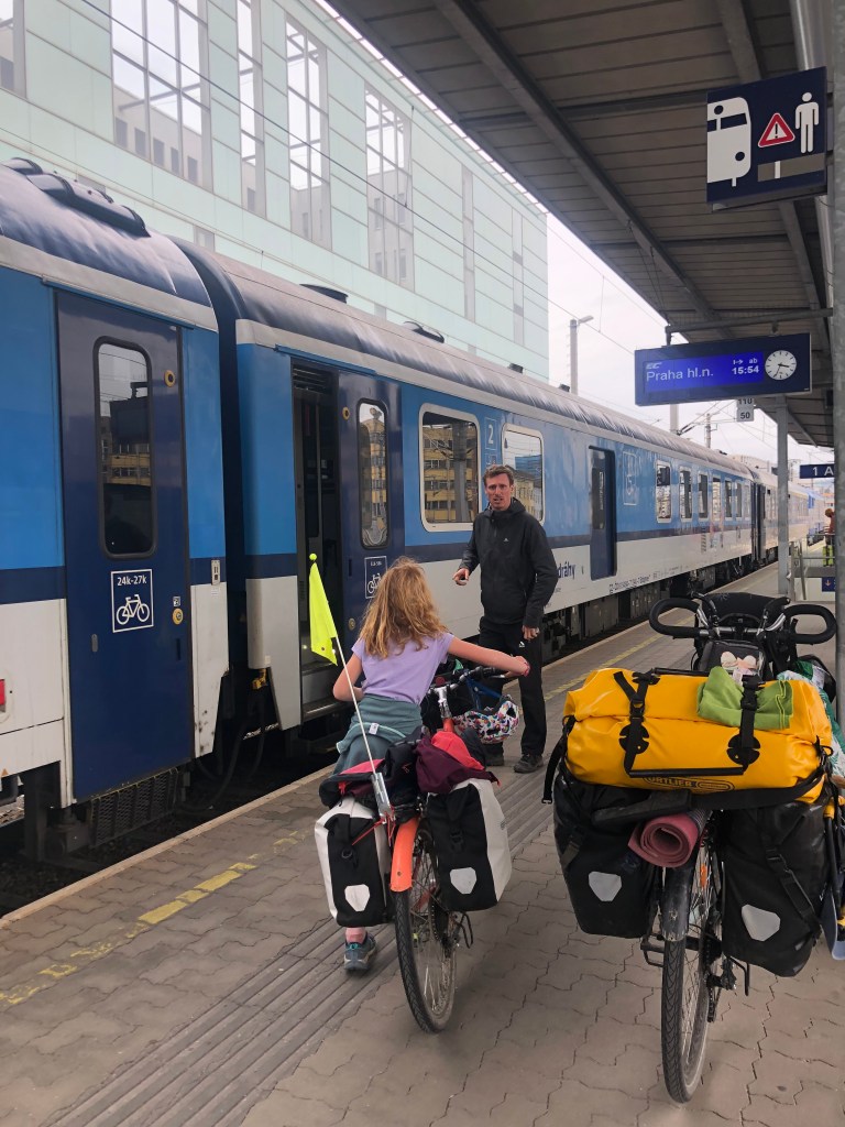 Nous préparons les sacoches, les enfants dessinent et partons direction la gare ! En arrivant, tout se passe très bien. La gare est équipé d’ascenseur, le train est déjà sur sa voie. Un vrai wagon vélo nous attend, bonheur. Nous avons juste à enlever toutes nos sacoches et à nous installer. Il est 15h54 quand le train part, dans 4h nous serons à Prague ! C’est la première fois qu’un trajet en train ou en transport en commun est si simple, si apaisé. Les enfants jouent tranquillement puis regarde un dessin animé. Nous dévorons le paysage : collines et forêts au programme.