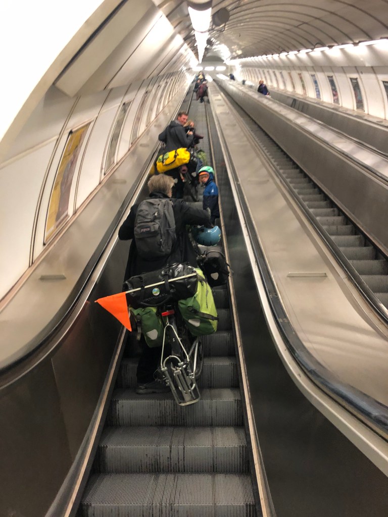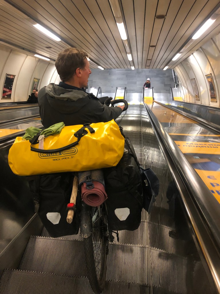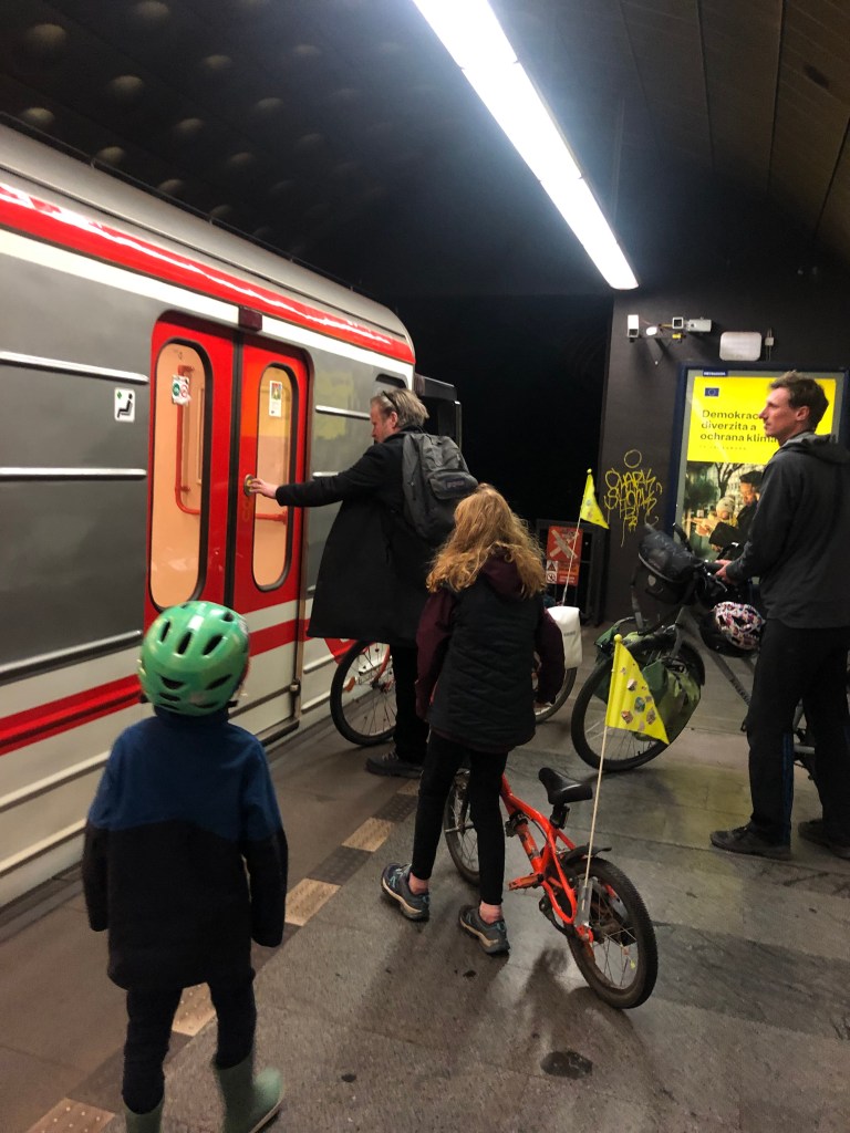 Le train arrive en gare. Rebelote. Nous rangeons notre bazar, nous sortons les sacoches, les enfants et les vélos, puis nous raccrochons les sacoches aux vélos, et quittons la gare. Dans le hall, un barbu de bonne allure et grisonnant nous adresse un signe amical, c’est Dan ! Dan est un ami américain de la famille depuis de nombreuses années. Il a vécu chez moi à Rouen pendant 1 an alors qu’il était étudiant quand j’avais 7 ans. Il a épousé Pavlina, une tchèque rencontrée cette année là en France et ils vivent à Prague. La dernière fois que je l’ai vu, c’était 10 ans plus tôt au mariage de mon frère Guillaume. Il nous propose d’emprunter le métro plutôt que de pédaler. Cela nous convient parfaitement ! Même si descendre puis remonter nos vélos chargés dans les escalators nous provoque quelques frissons.