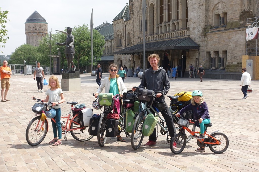 A Osnabrück, encore un changement de train. Il faut faire vite. Petite frayeur car le quai annoncé sur le billet ne dispose pas d’un ascenseur en état de marche mais finalement le train part d’un autre quai. Le grand wagon vélo semble blindé, et d’autres portes ont un sigle vélo. Nous nous séparons. Clem et moi passons les presque deux heures du trajet à côté de nos vélos pour s’assurer de ne pas déranger. Les enfants se sont trouvé une place et écoutent leurs histoires dans le calme. Un cyclo-voyageur allemand parlant français nous tient compagnie. La descente sur le quai à Duisburg est un peu stressante mais finalement nous gérons cela. Nous sommes devenus des maîtres en gestion de train-vélo. La bonne nouvelle, c’est que nous sommes déjà sur le bon quai ! Il est 15h40. Et nous enchaînons les trains depuis 10h15 ce matin. Il est temps de se restaurer. Nous trouvons des nuggets et des frites (pas par terre hein, nous les achetons).
