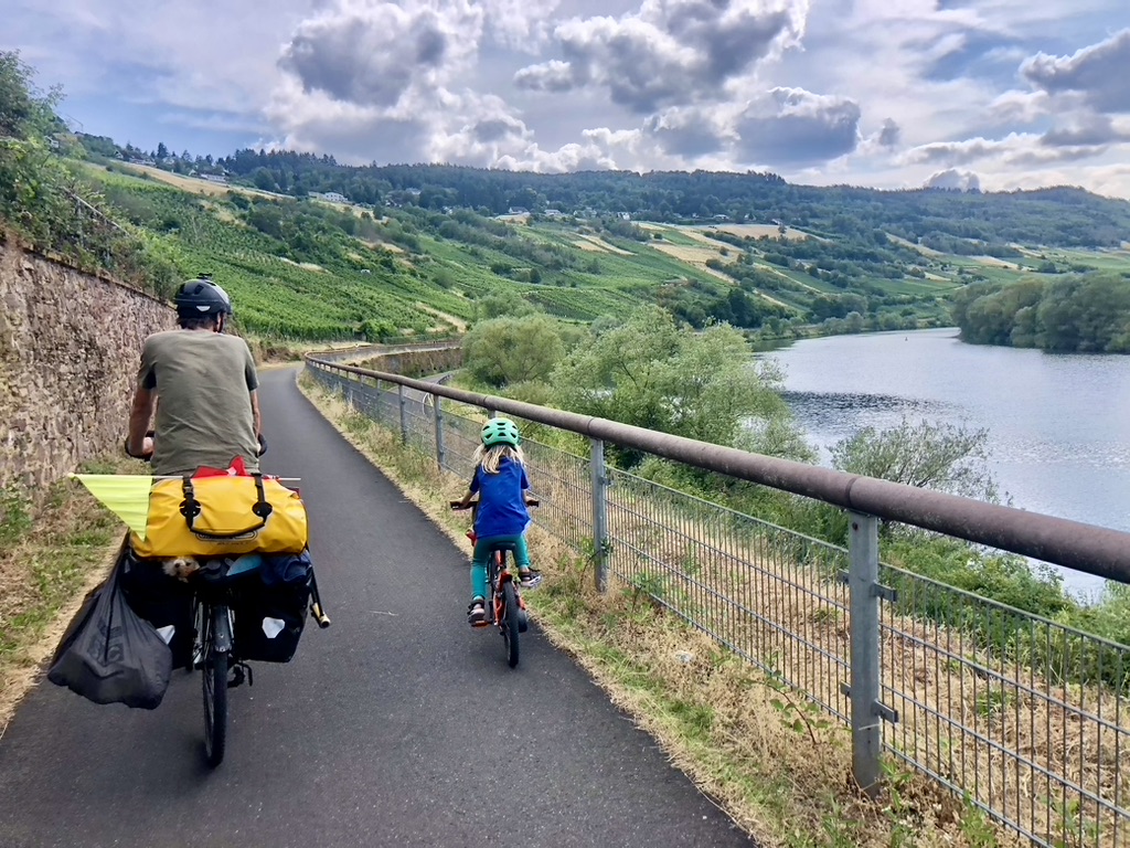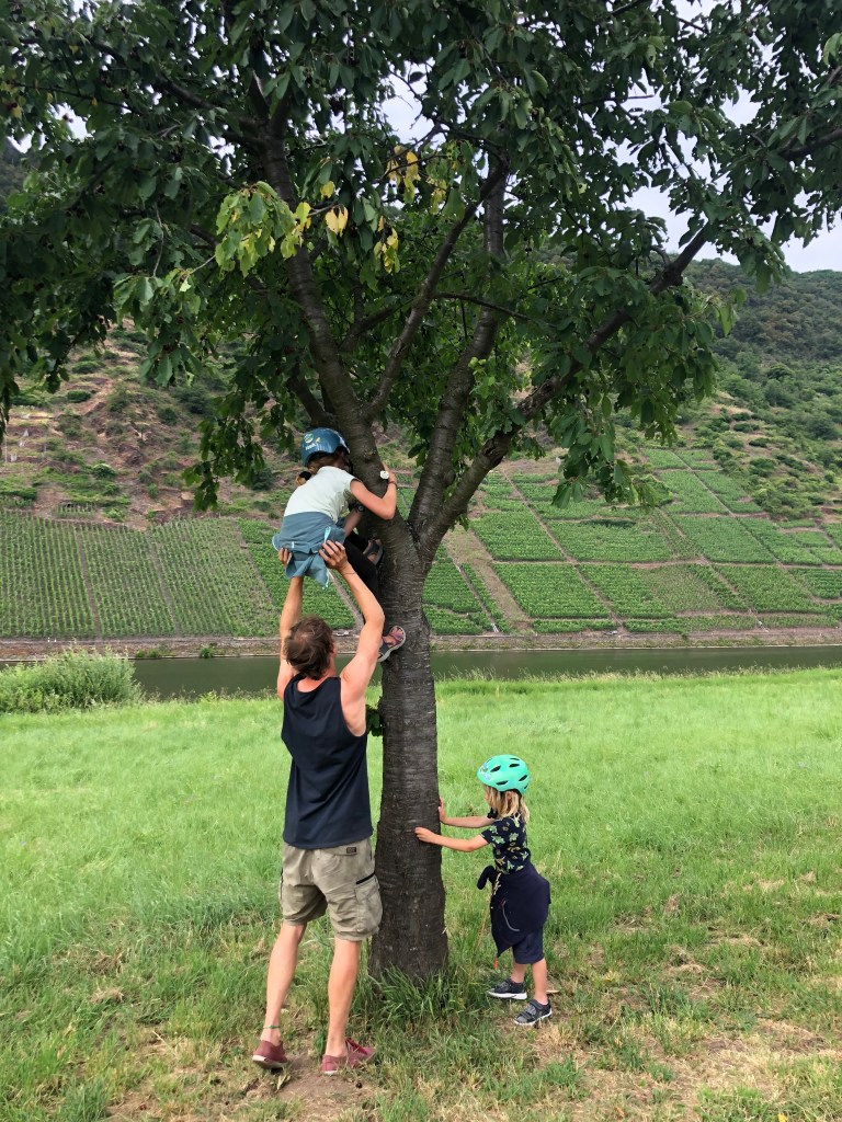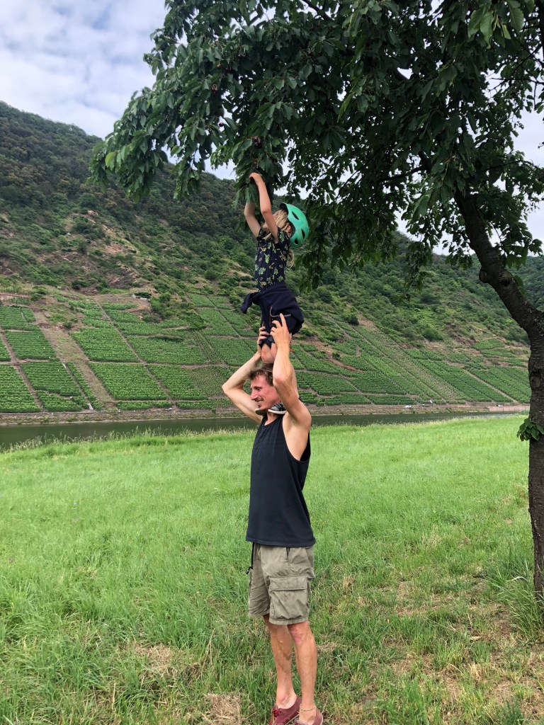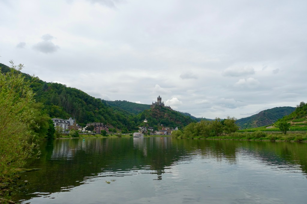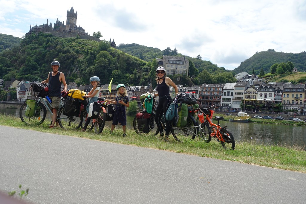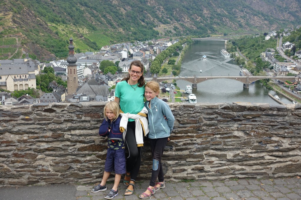 Nous arrivons à motiver les enfants à pédaler une dizaine de kilomètres jusqu’à Cochem. Nous montons jusqu’au château perché sur un roc d’où il domine toute la vallée de la Moselle. Ses pierres sombres se fondent dans les arbres et la vigne qui l’encerclent. A l’occasion de mon anniversaire, Clem et moi dégustons deux grosses parts de « Forêts noirs ». Il va falloir pédaler après ça !