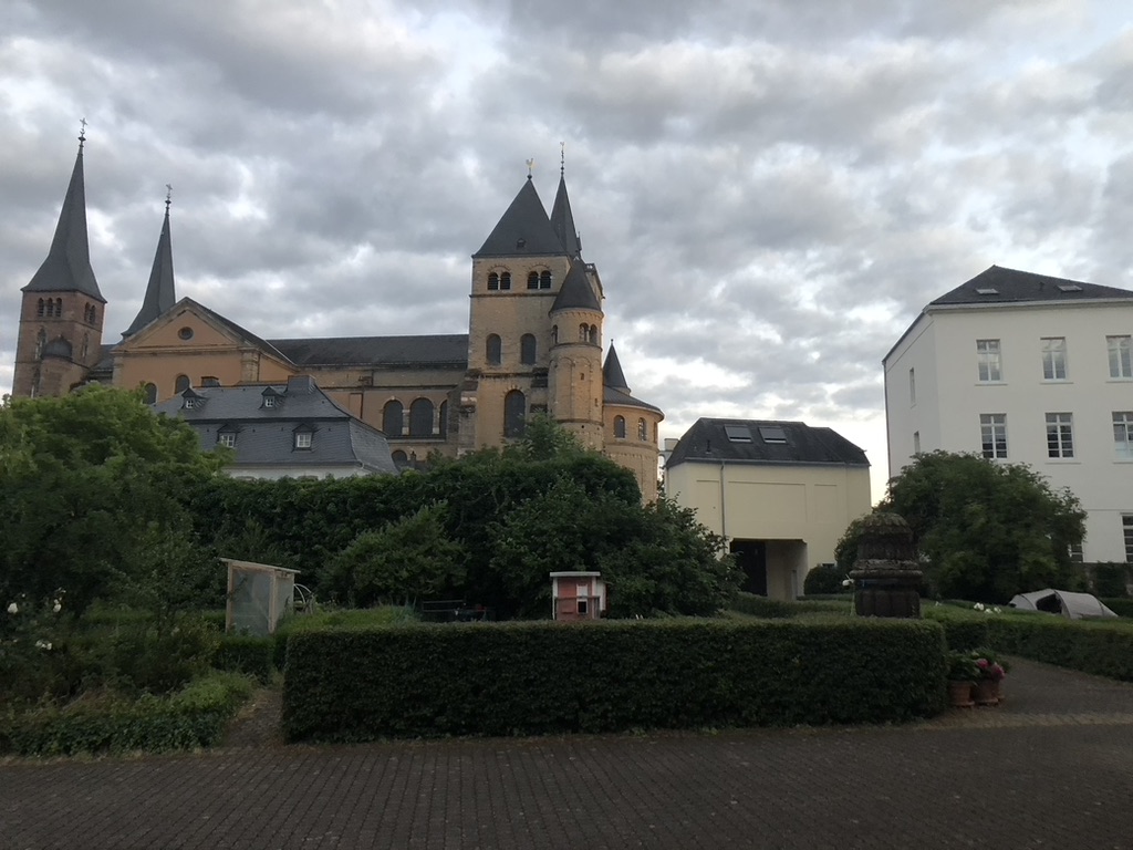 Nous arrivons à Trêves a 15h45. Notre hôte nous a donné rendez-vous devant la cathédrale. Nous devons dormir sous la tente que nous planterons dans son jardin. C’est un peu surprenant d’imaginer un jardin en plein centre-ville ! Il doit s’agir d’un hôte riche comme Picsou ! Pourtant, il se présente comme un pèlerin dans son profil sur le site. Lorsque nous le rejoignons chez lui, nous comprenons en voyant le col romain défait sur le col de sa chemise grise. Il s’agit du prêtre de la cathédrale et il nous accueille dans le jardin du presbytère !