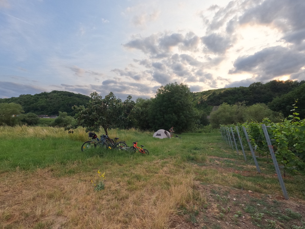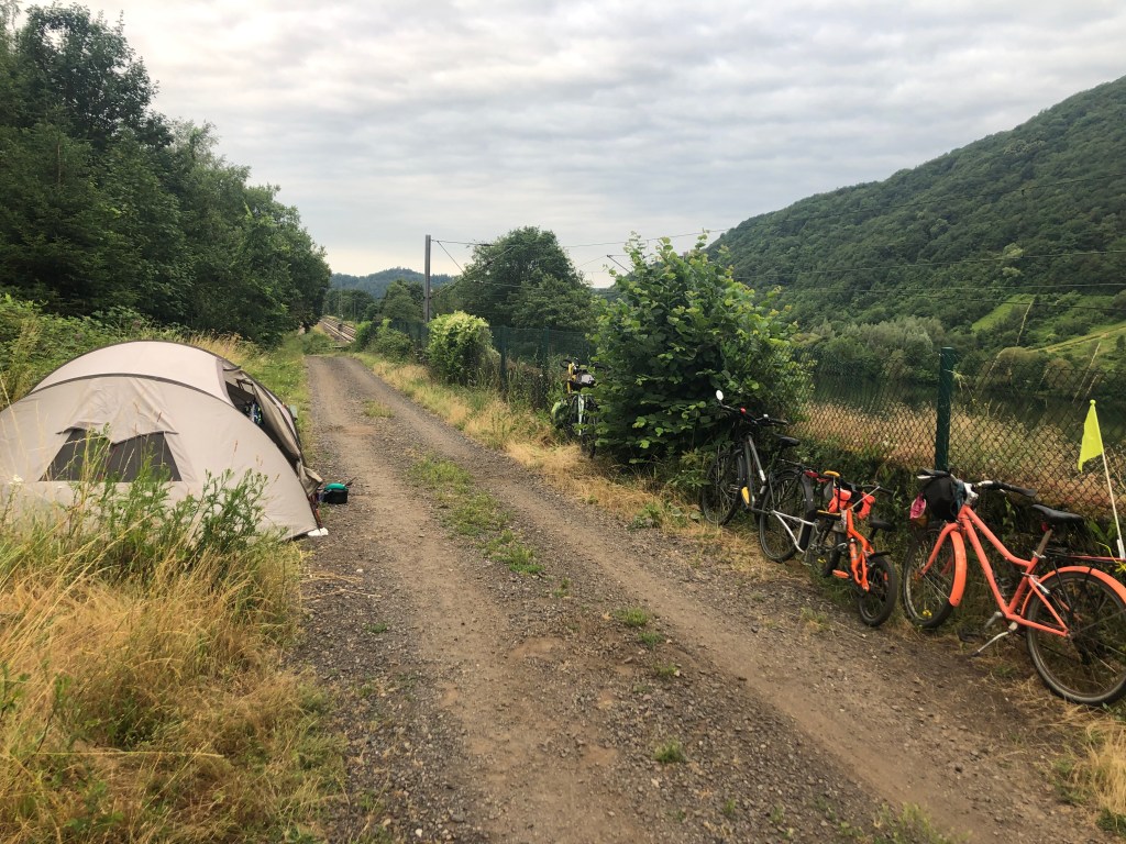 A Coblence, un petit encas et nous pédalons ! Il est 19h30, et nous voulons bivouaquer au bord de la Moselle. Après cette journée de train, cela fait beaucoup de bien de se dégourdir les jambes. C’est un plaisir de retrouver ce fleuve à côté duquel nous vivions il y a 10 ans quand nous travaillions au Luxembourg. Les enfants pédalent de bon cœur malgré l’heure tardive. Après 7 km, nous trouvons une grande plaine pas trop proche de la ville ou de la grosse route passante pour planter la tente. C’est agréable de faire de nouveau du bivouac, cela nous change des shelters danois !