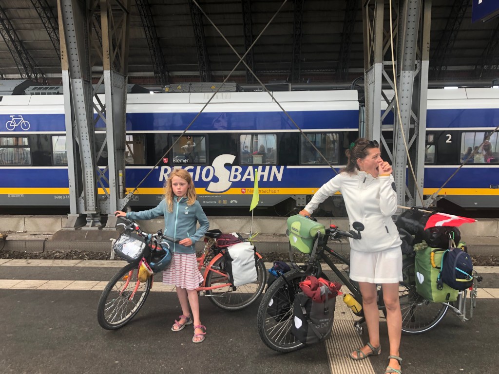 Nous embarquons dans notre premier train, pour Brême. Pas de souci pour monter même s’il y a toujours un peu de stress. Il y a beaucoup de monde sur le quai. Je ne comprends pas pourquoi des voyageurs sans vélo s’entêtent à vouloir monter dans le train à la même porte que la douzaine de cyclistes présents. Nous ne trouvons pas de place ensemble, les enfants préfèrent s’asseoir sur un porte-bagages plutôt qu’à côté d’étrangers. Les nombreuses personnes qui occupent deux places nous surprennent. Leur valise est-elle si douillette et délicate qu’elle doit s’asseoir sur une place ?
