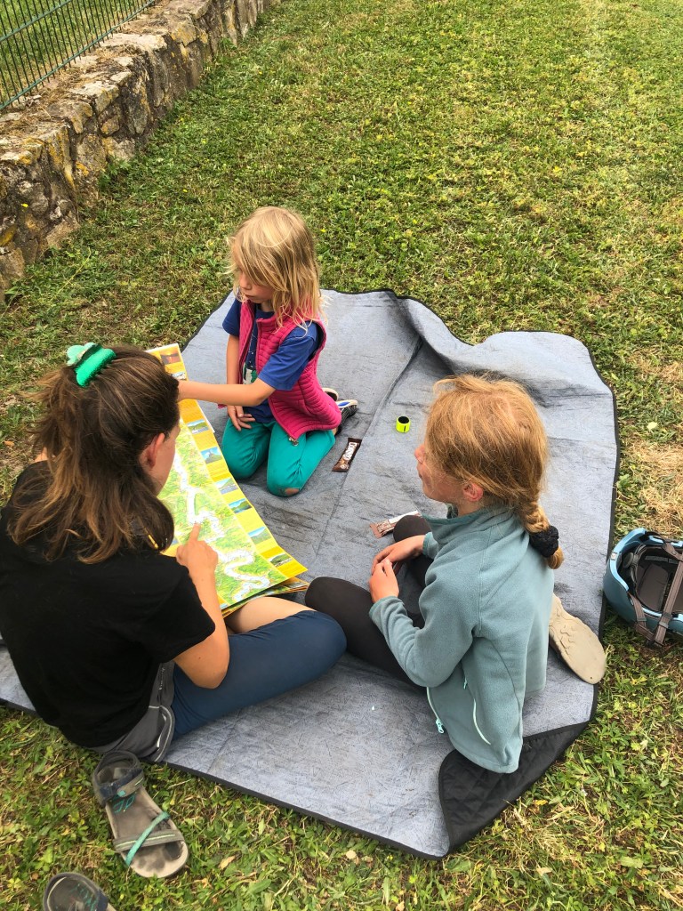Le dernier train est superbe. De la clim, des places vélo accessibles, et de la place pour nous 4. Le trajet dure 2h. Les enfants écoutent encore un peu d’histoires puis activité manuelle pour Arsène et écriture d’une carte pour Maxine. Le paysage nous est familier. Nous retrouvons le Rhin que nous avons tant aimé suivre l’été dernier.