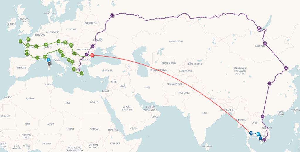 En décembre 2021, face à la nouvelle vague de Covid 19 et ses nouveaux variants, nous reprenons notre itinéraire de zéro pour réfléchir à un voyage 100% européen. En effet, les frontières de la Chine, et du Vietnam sont fermées. Toutes celles des pays en dehors de l’Europe sont incertaines. Le climat entre l’Ukraine et la Russie laisse franchement à désirer [màj 01/03/22 : bon, on a bien fait de renoncer à la Russie !]. Nous voyagerons ainsi à vélo pendant 1 an combiné avec le train et le ferry quand nécessaire. Cela nous permettra de faire des sauts de puce et éviter des conditions météo ou de trajet trop défavorables.