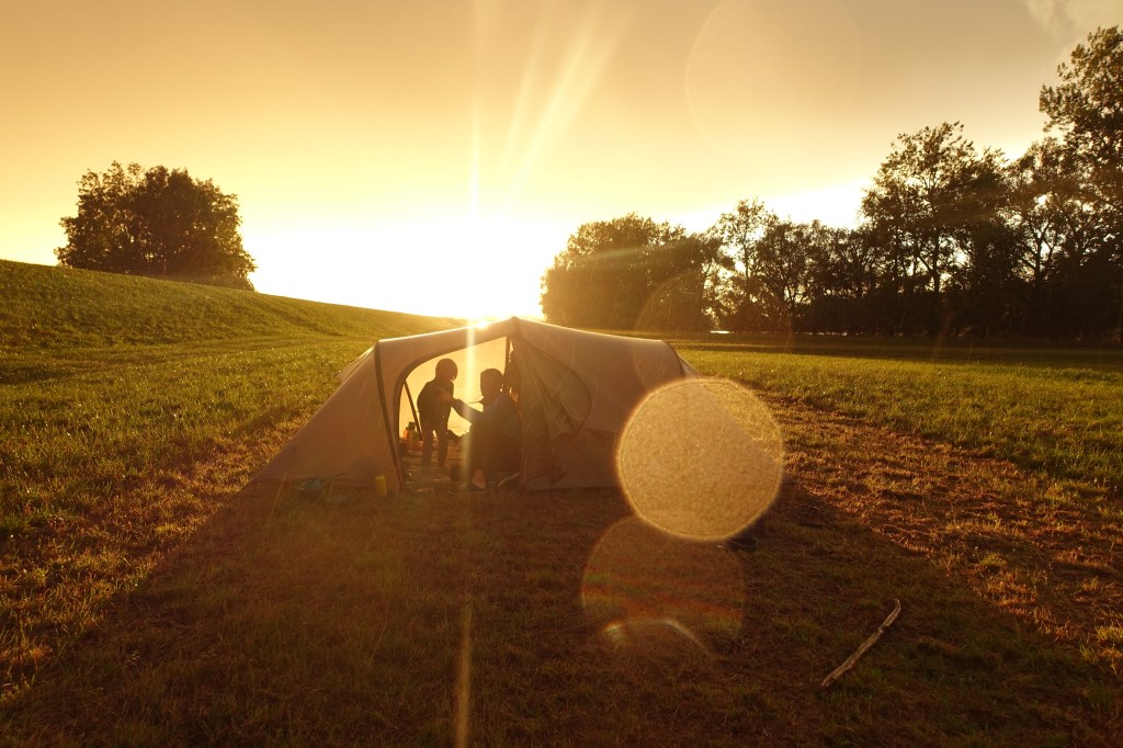 Nous trouvons un spot bivouac vers 18h sur une île boisée. Comme d’habitude, je ne suis pas trop rassuré mais les enfants sont contents de pouvoir jouer dans les bois et nous ne dérangeons personne sur notre petit carré d’herbe à l’orée de la forêt.