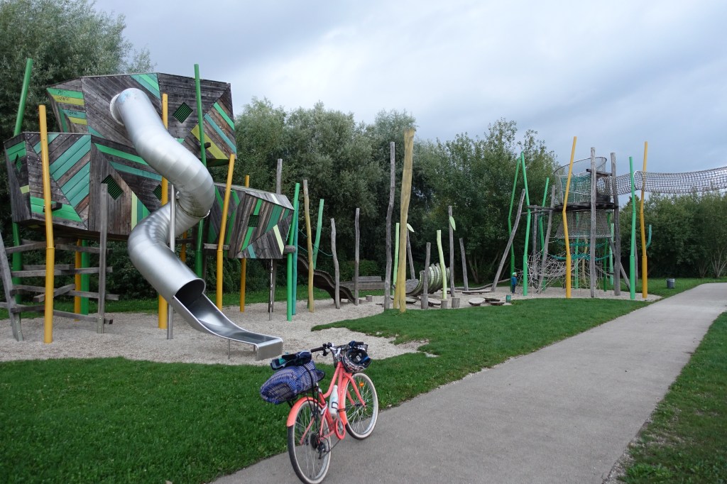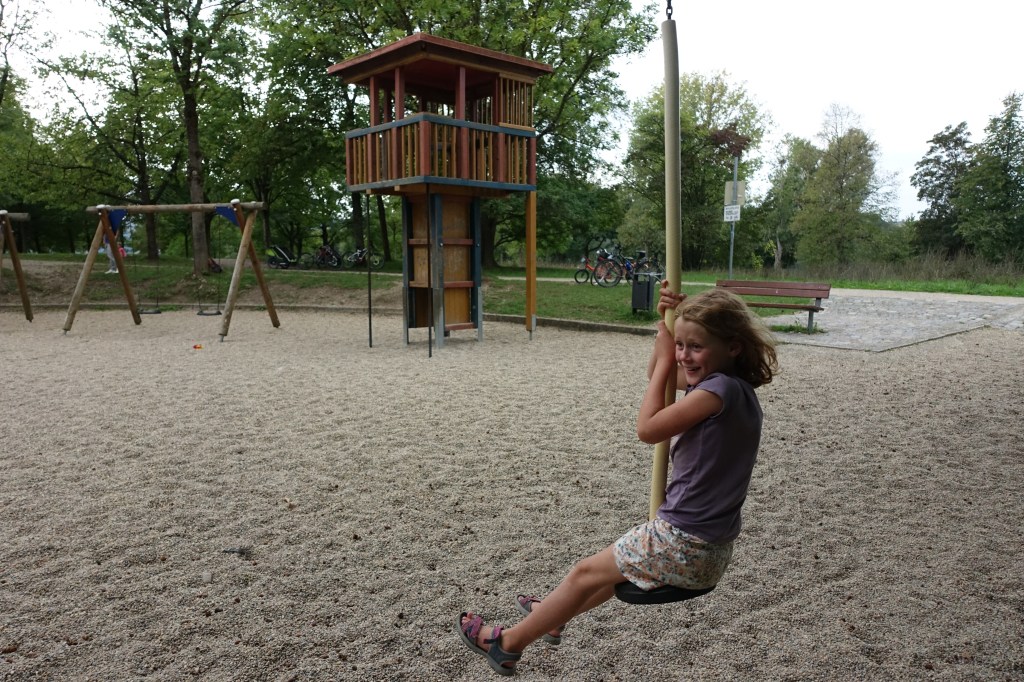 Nous roulons quelques temps sur des petites routes paisibles puis nous retrouvons la digue du Danube et son vent du nord. Il est 13h, pas de magasin et pas grand-chose à manger dans les sacoches et nous sommes en train de combattre le vent. Je ne vais pas m’éterniser sur ce passage qui nous a causé souffrance, démoralisation, et énervement. Le pique-nique après ravitaillement n’a pas été satisfaisant pour les adultes. Nous étions à nouveau à une aire de jeux et on commence sérieusement à saturer. En plus les enfants ne prennent pas la peine de se reposer ou de s’apaiser lors des pauses : ils s’excitent ! Résultat au moment de repartir, ils font la moue et n’ont pas beaucoup de motivation, en particulier Maxine. Nous arrivons à Tulln après de nouveaux kilomètres face au vent. Je me sens vide. Je n’en peux plus de tirer Maxine.