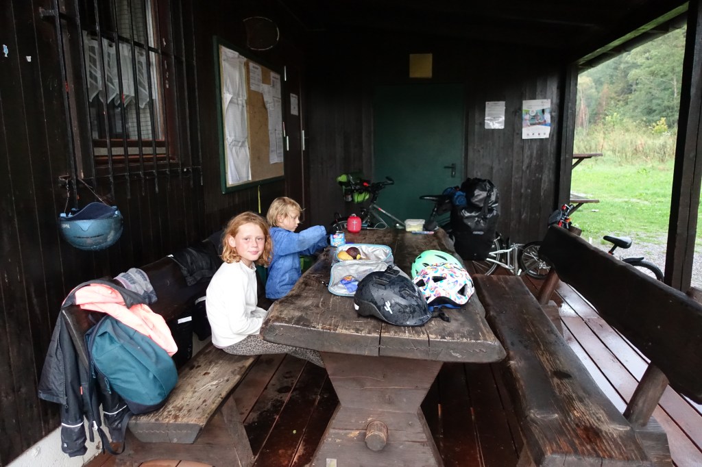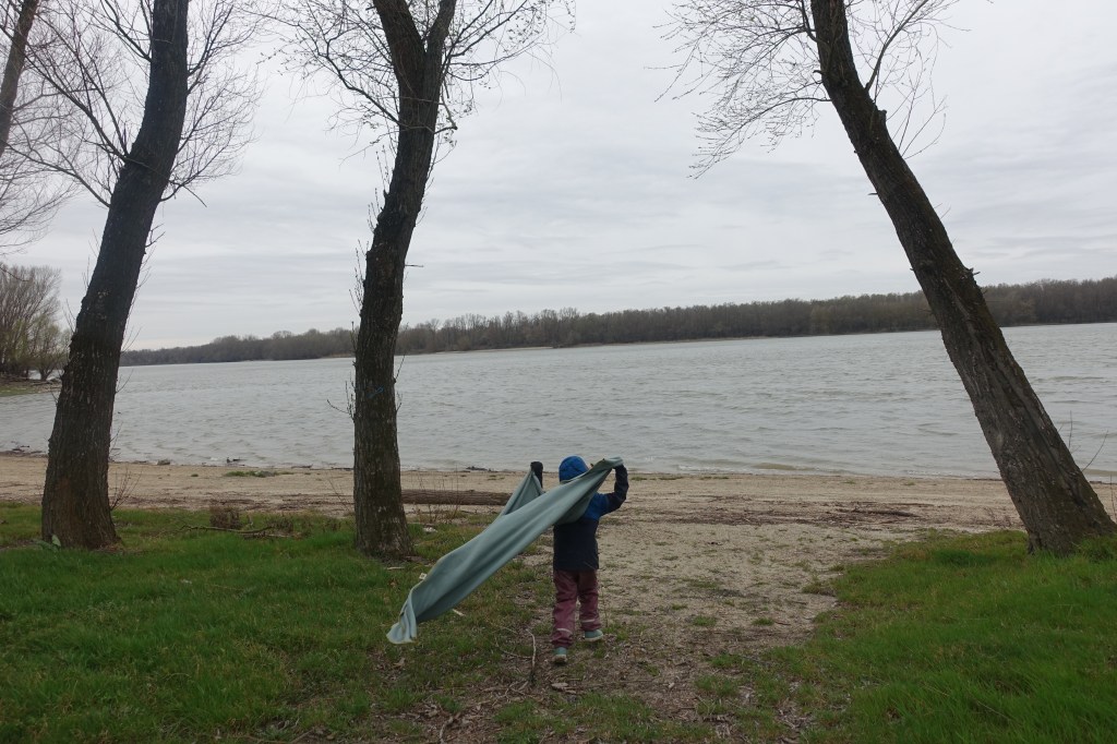 Nous retrouvons le Danube dans une réserve naturelle, loin de la civilisation. Au bout quelques minutes, nous dégotons un chouette endroit pour déplier la tente au bord du Danube, au-dessus d’une jolie petite plage de galet. Il y a une cabane à moitié construite, les enfants sont ravis et revivent !