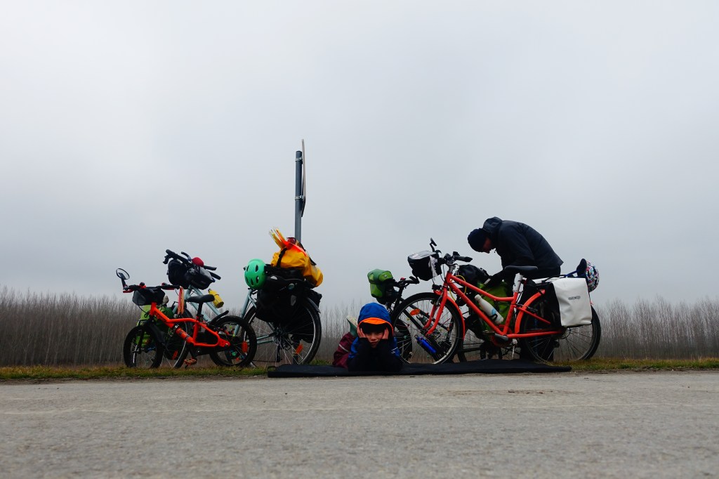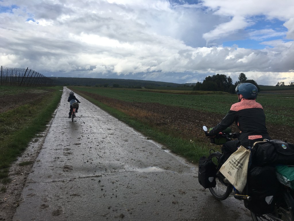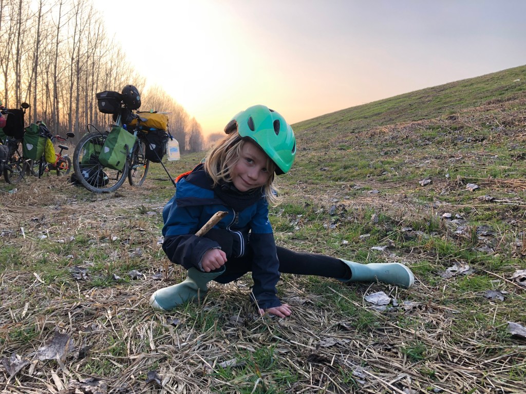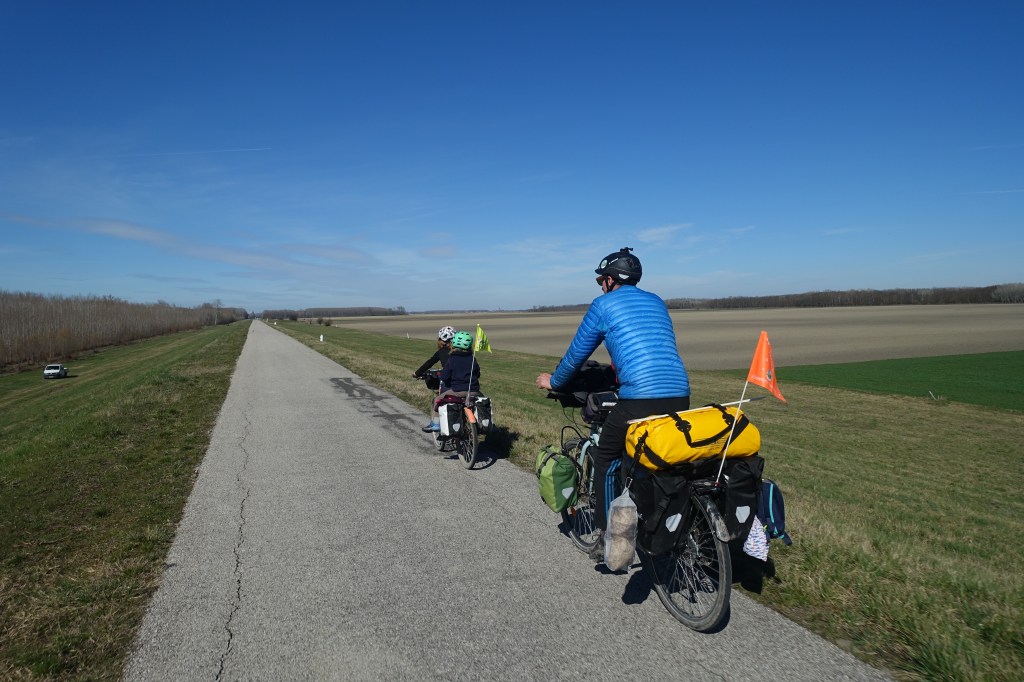 Nous retrouvons la digue du Danube ! Et un vent frais et fort. Mais vraiment fort. Tellement fort qu’il fera encore tomber Clem. Nous avançons, concentrés sur l’objectif et motivés par une nuit au chaud. Maxine entonne des comptines. Les rafales nous épuisent, nous freinent. Arsène encourage Clem.