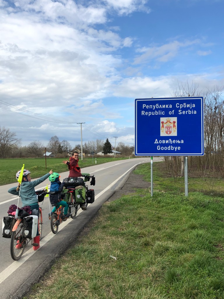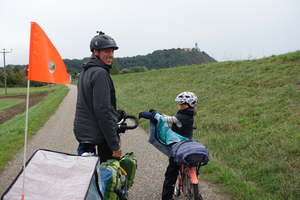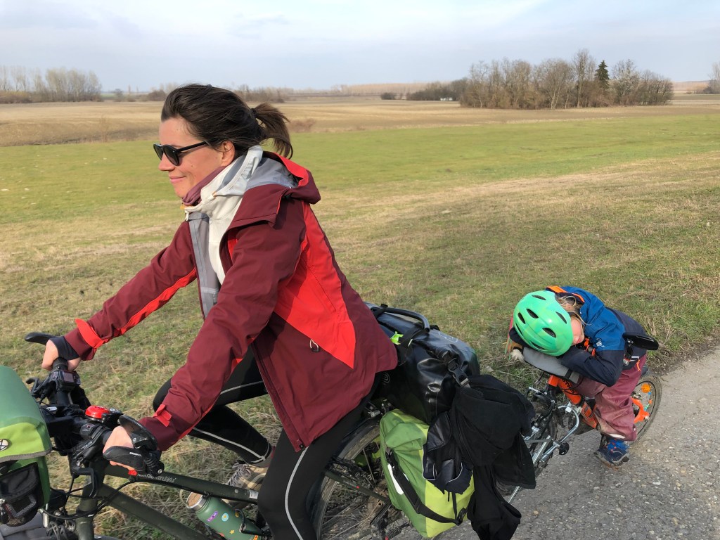Nous partons vers 12h15. Nous retrouvons le bord du Danube et un vent de face bien plus léger qu’hier et avant-hier. Maxine est bien motivée pour rouler et joue avec son petit frère. Au loin, nous devinons que le fleuve s’engouffre entre les montagnes, ça va être grandiose !