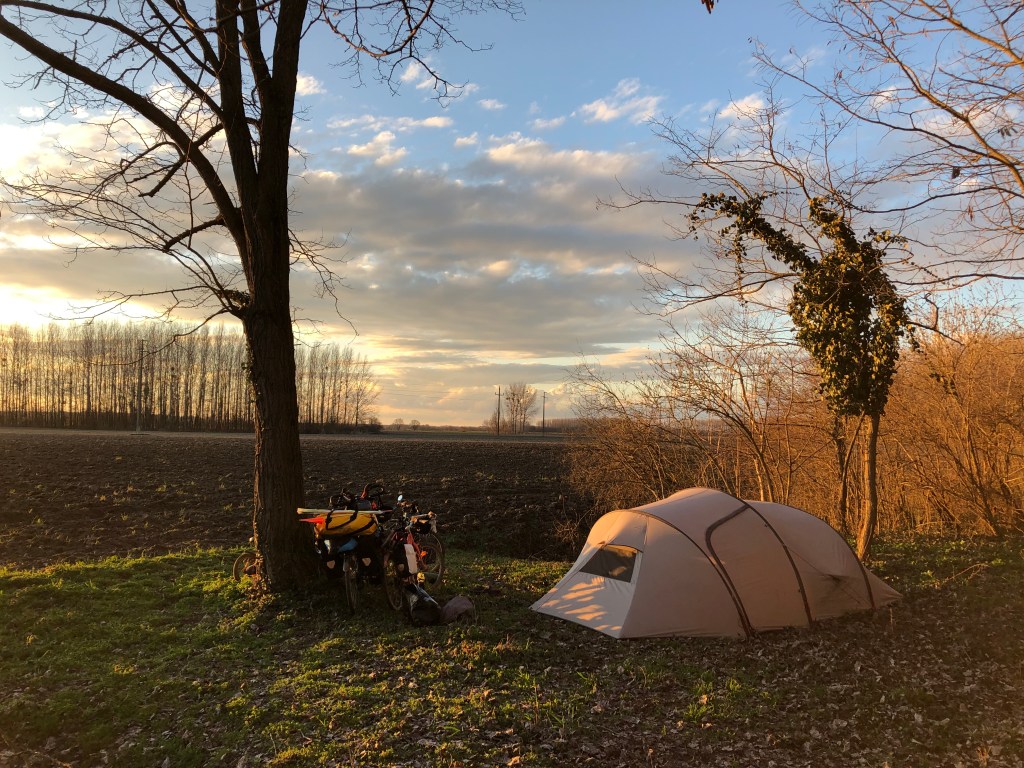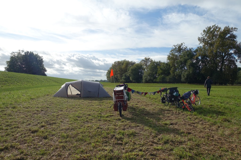 Vers 17h, bingo ! Nous atteignons les 50 km ! Wouhou ! Il nous reste plus qu’à trouver un endroit où dormir. Nous nous mettons aux aguets. Nous observons les maisons autour de nous. Je demande à une première personne, je reçois un « Nein » (ce qui veut dire non en allemand). Pourtant, sa maison était entourée de prairies… Un deuxième non plus tard, on se dit qu’on va arrêter de demander et se poser dans un coin discret. Nous retrouvons la digue et le Danube. Au pied de celui-ci, un terrain de foot à moitié abandonné. Ça nous donne bien envie mais nous ne sommes pas très à l’aise. Une maison pas loin, des habitants qui nous confirment qu’on peut se poser, et hourra ! Dernier bivouac autrichien ! (Si notre Warmshowers est toujours ok pour nous accueillir demain soir à Linz…)