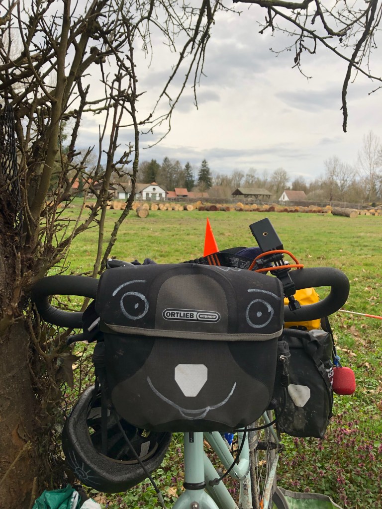 Maxine boude déjà, la journée s’annonce bien dis-donc ! Nous arrivons à la frontière. Nous pédalons en combattant le vent qui arrive sur le côté et nous balaye littéralement. Clem en perd l’équilibre et tombe à vélo une fois. Les rafales à 54 km/h sont costaudes et rendent la progression laborieuse. Nous guettons un abri pour pique-niquer sans trop se refroidir. Nous le trouvons qu’après 16 km de notre départ, un peu avant 13h près de l’église de Wolfstahl. Nous repartons rapidement et trouvons une jolie piste cyclable à l’abri du vent. Dès que nous la quittons, le vent dans le dos nous propulse dans une montée. Nous faisons une bonne pause à Hainburg. Un message d’Hedvige nous apprend que nous avons oublié nos deux couvertures polaires, les boulets ! Purée ! Il fait -1 degré ce soir ! Heureusement, nous sommes à proximité d’un centre commercial. Je trouve deux nouveaux plaids en allant faire le ravitaillement.